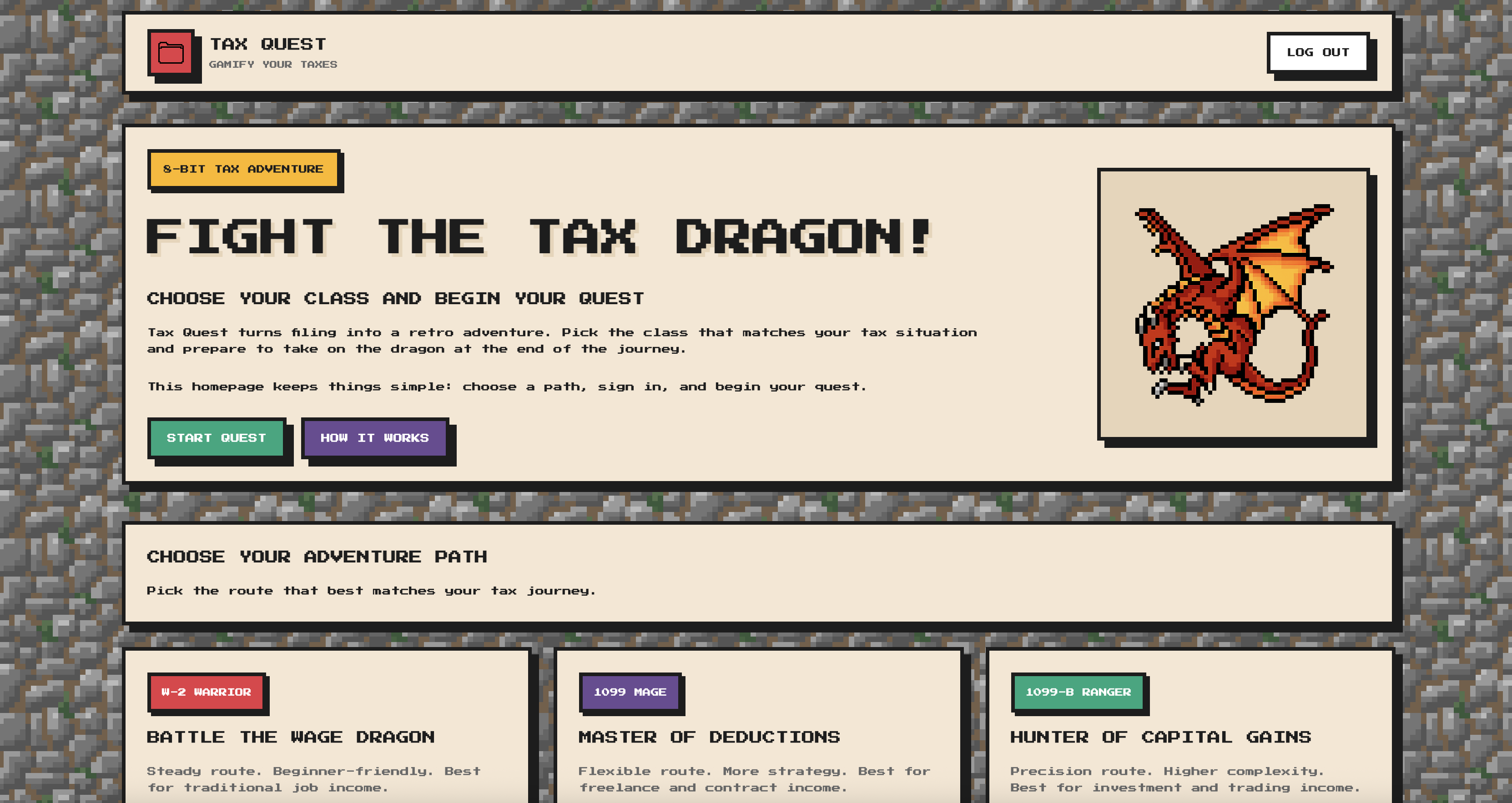 Taxes are one of those universal experiences that almost everyone dreads—confusing, tedious, and stressful. We thought: what if we reframed that experience into something fun and engaging? Inspired by classic RPGs and retro sprite-based games, we turned the “final boss” of adulthood—filing taxes—into an actual dragon battle. Instead of avoiding taxes, players would want to complete them to progress.