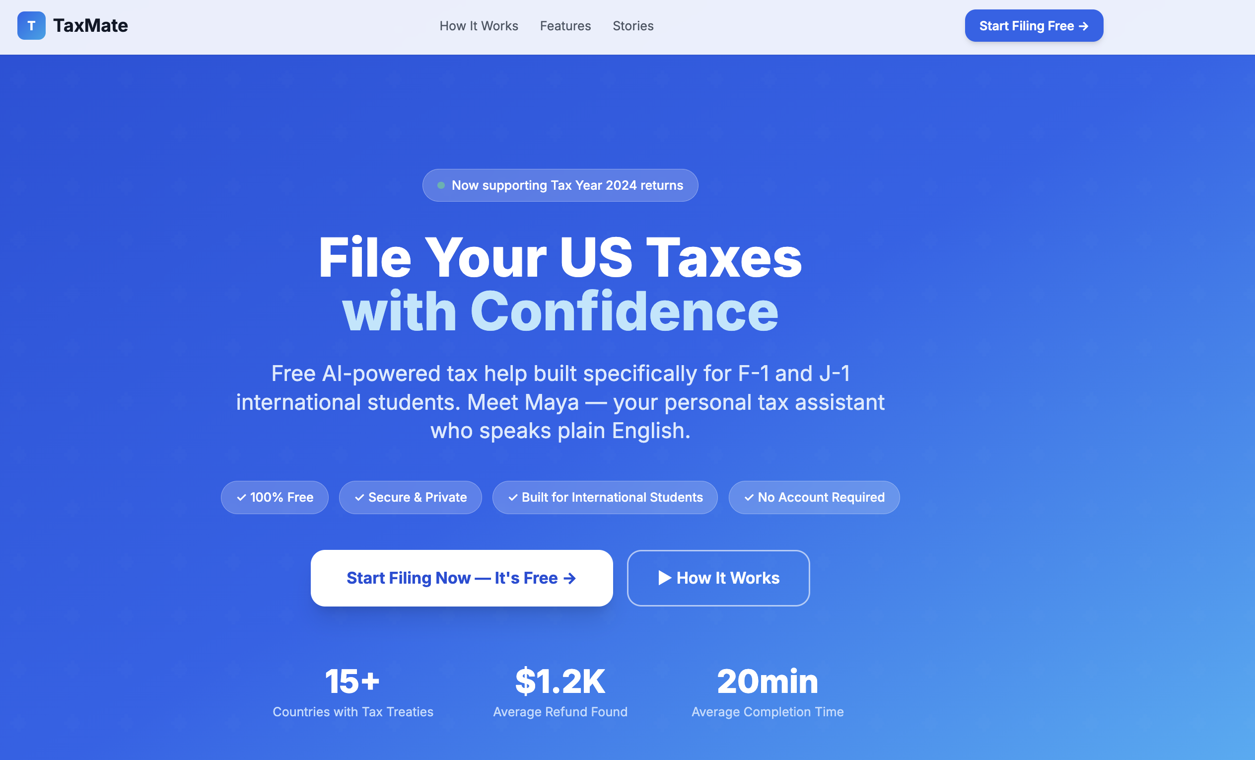 TaxMate is a free AI-powered tax assistant built specifically for F-1 and J-1 international students. You chat with Maya — a friendly AI — who guides you through the entire filing process in plain English, step by step.