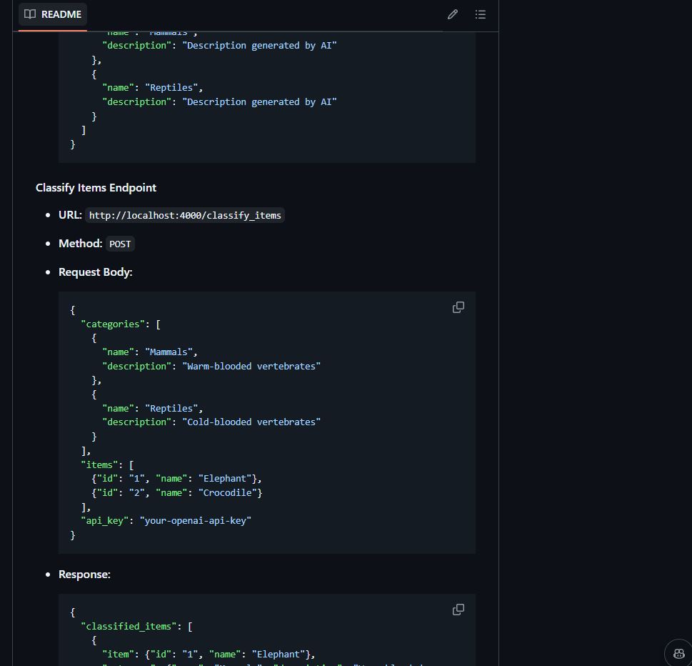 - Generate subcategories and classify items using the backend API.