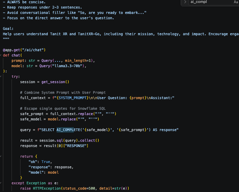 Snowflake Cortex: We used AI_COMPLETE to run Llama 3.3, providing Eric with deep knowledge of Tunisian history.