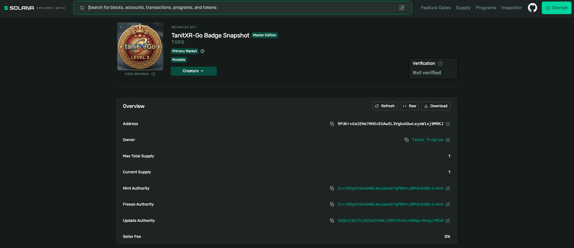 Screenshot of Badge NFT Minted on Solana Devnet -> On-chain Proof you earned it!