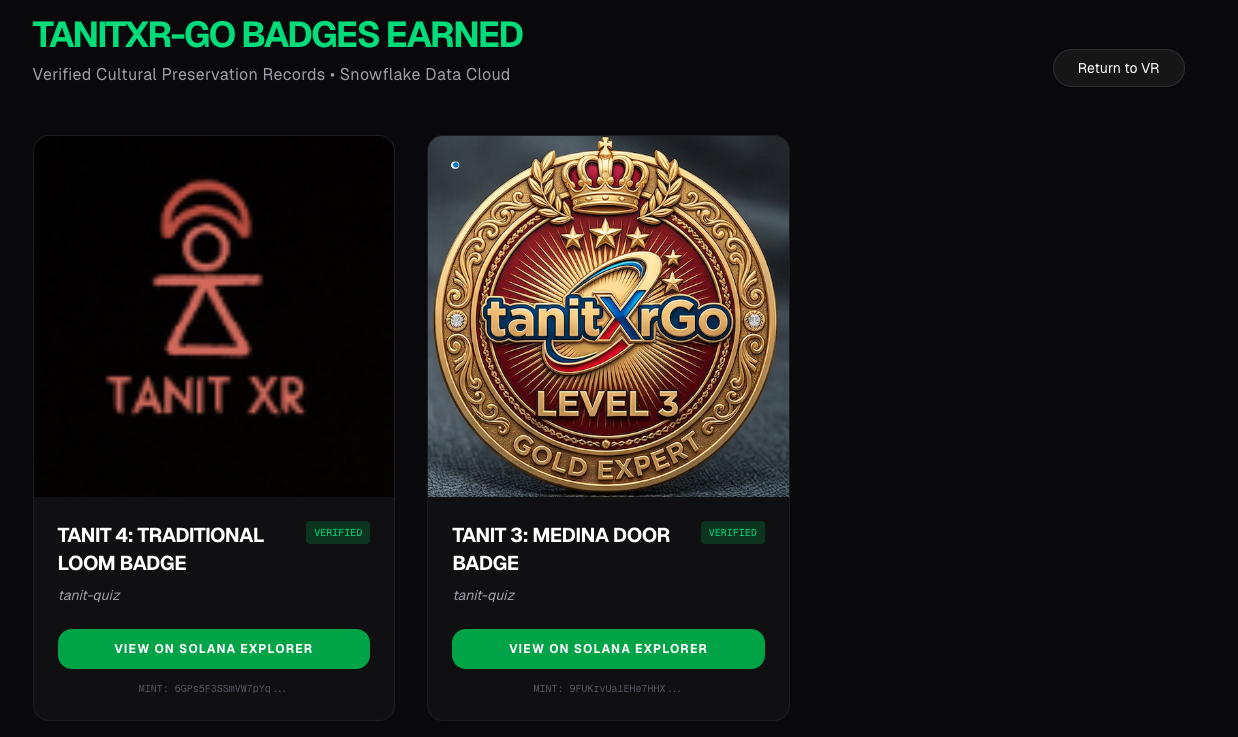 We utilized Solana to solve the problem of "achievement vanity." By minting badges as compressed NFTs, we provided users with verifiable proof of their learning journey at a fraction of a cent. This allows TanitXR-Go to scale to thousands of users and artifacts without the barrier of high gas fees, making cultural education truly decentralized.