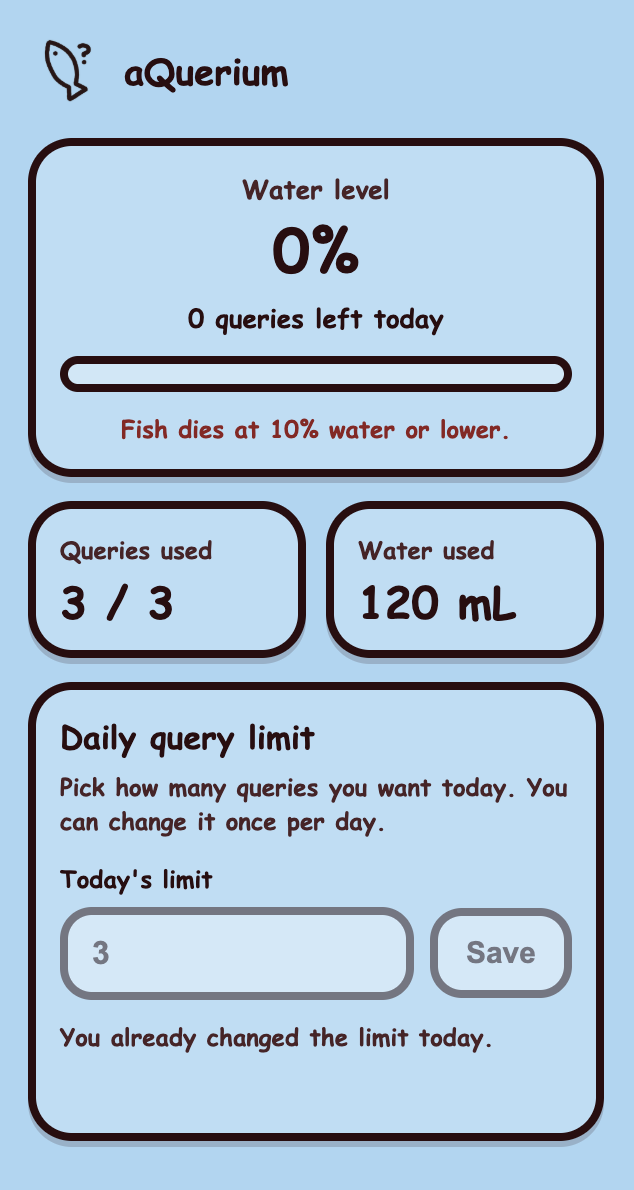 aQuerium is an AI water usage tracker in the form of a desktop aquarium that activates on artificial intelligence platforms, like ChatGPT or Claude. When the user enters a query into an AI model, the water level in the virtual aquarium drops. But don’t let the water drop too low—the fish won’t survive! If the user fully empties their aquarium, they can reset their query limit (max 50 queries) once a day and check their statistics in the extension window.