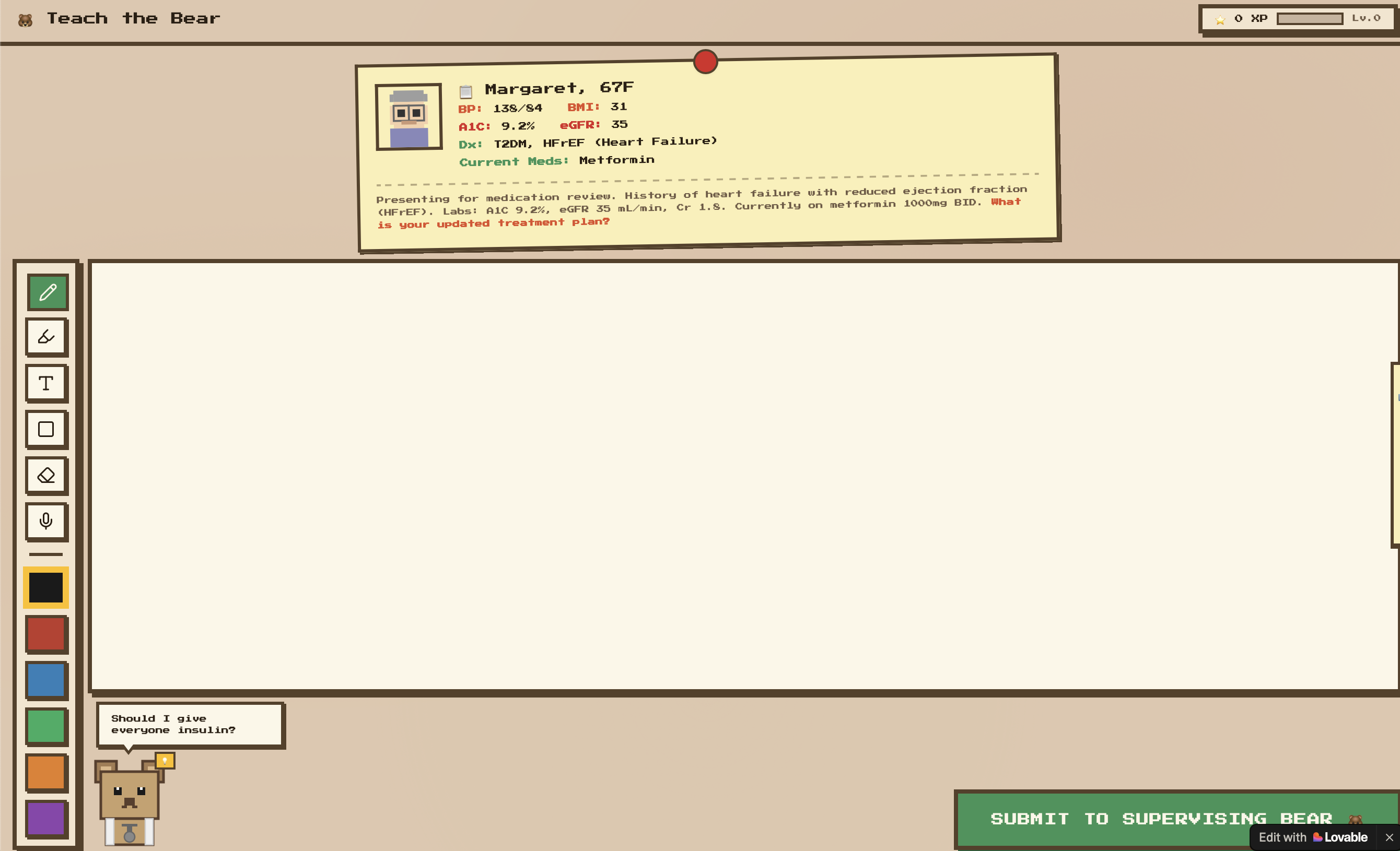 What it does Teach the Bear puts you in the role of a medical student whose job is to teach Dr. Teddy — a clueless, wide-eyed little bear who knows absolutely nothing about treating Type 2 Diabetes. You write a cheat sheet, draw diagrams, and explain your reasoning directly on his whiteboard clipboard so he can follow it when he sees a real patient. You can peek at synthesized clinical guideline notes if you're stuck, but the bear is watching and your score reflects every time you do. Once you submit, the Supervising Bear — his strict, glasses-wearing, arms-crossed attending — storms in and grades your teaching plan against the actual T2DM clinical guidelines, telling you exactly what you got right, what you missed, and why it matters clinically.