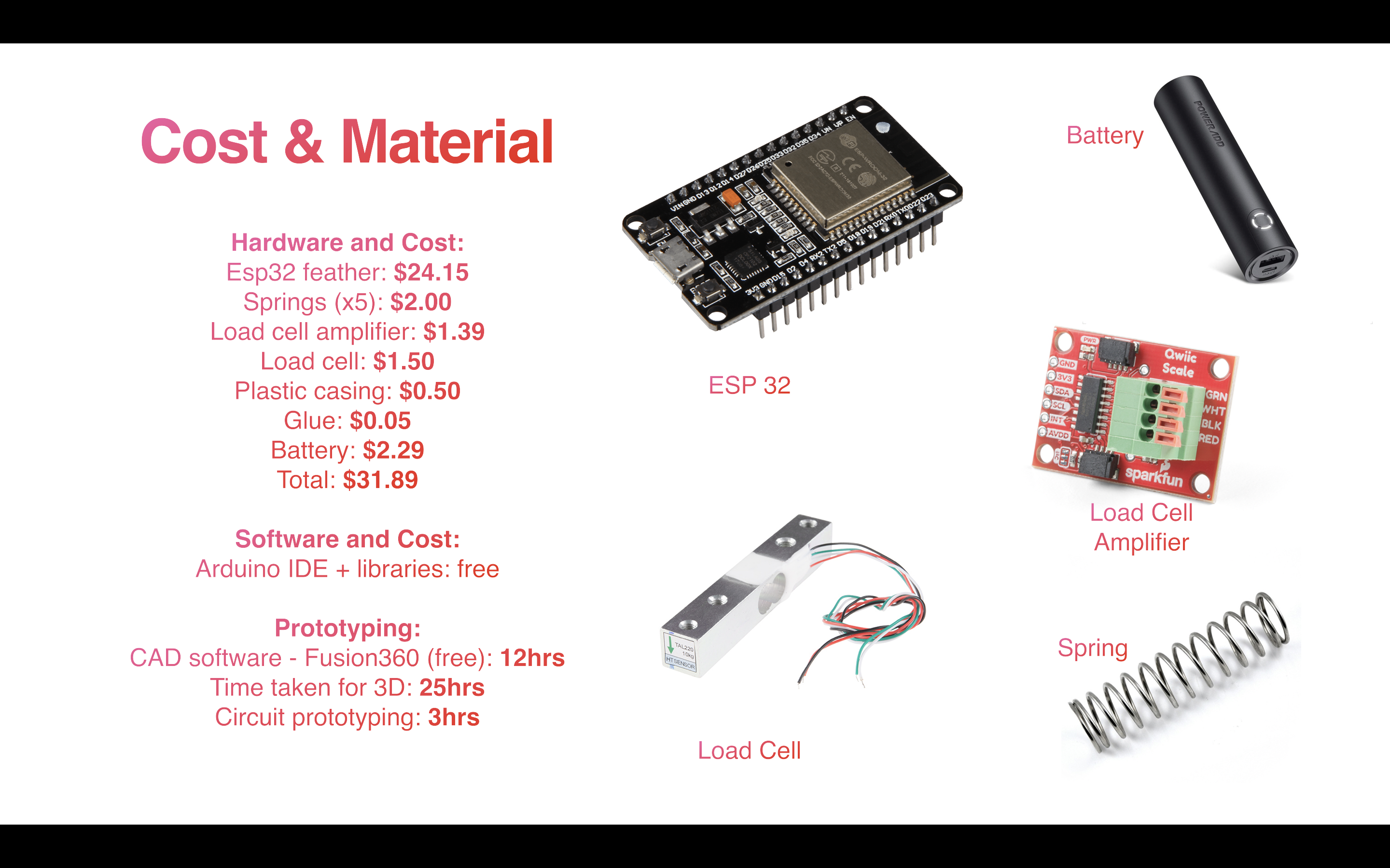 We used Blendr and AutoDesk Fusion360 to 3D print the body of the item. Inside the product, we attached 5 springs connected in parallel to a SparkFun loadcell, which we then connected to an amplifier and then a ESP32 Feather V2 microprocessor. Force exerted from the spring is interpreted as compressions according to the code stored in the Feather and then finally transmitted via WiFi to the Blynk IoT mobile app.