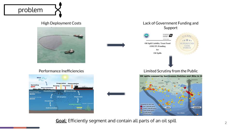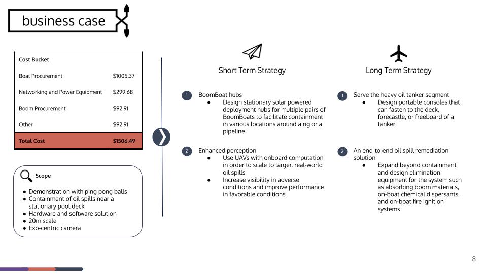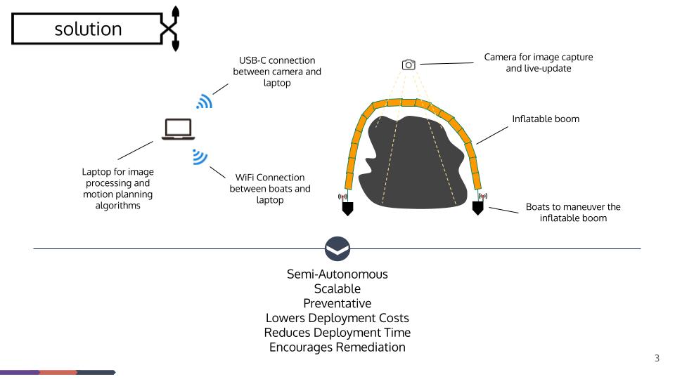 Oil rigs, tankers, and pipelines are susceptible to failures and leakages that cause immediate and detrimental ecological effects on a micro and macro scale. Small scale oil spills (<7 tons) are often unresolved or partially resolved due to poor detection systems and company interest in public image. BoomBoat seeks to improve upon existing methods for oil spill remediation with an autonomous method of containment. With BoomBoat, governments and NGOs can allocate funds more efficiently to remediation, oil/gas firms can proactively tackle spills that otherwise may go unresolved, and affected sea users and wildlife can avoid economic and physical damage.
