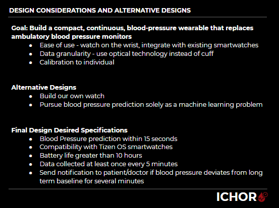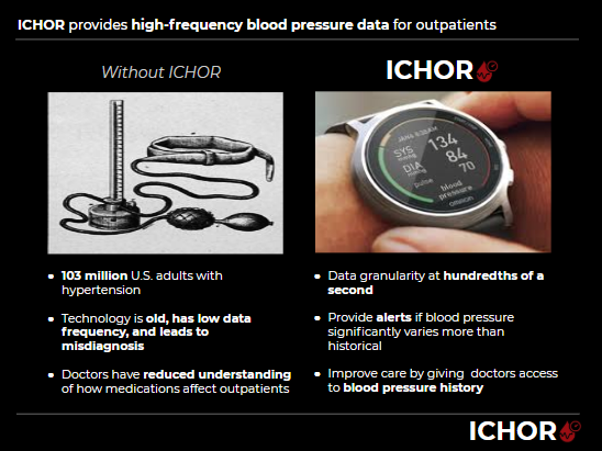 Currently there are two main use cases for Ichor: As a diagnostic tool for assessing hypertension and a cardiovascular care management platform. There is a severe clinical failure to integrate home-based blood pressure monitoring into cardiovascular disease diagnosis and treatment which is why Ichor is extremely valuable as a replacement for ambulatory blood pressure monitors (ABPs). Numerous studies have revealed significant rates of misdiagnosis of hypertension due to static blood pressure measurements in stress-inducing clinical settings. This increases overall quality of care and reduces system-wide costs. Furthermore, doctors lack insight into how various medications affect a patient’s vitals like blood pressure and heart rate throughout the course of a day, week, or month. Having this information can help enable clinicians to perform advanced chronic care management for at-risk patients, saving payors and providers hundreds of millions of dollars. In the long-run our goal is for Ichor to additionally serve as a non-invasive vital sign monitor for use at home as a personal health tool as well as in skilled nursing facilities (SNFs) like rehabilitation centers and assisted living facilities.