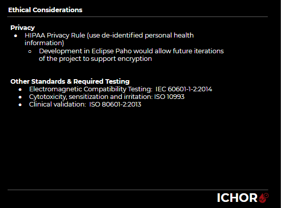 - HIPAA Privacy Rule (use de-identified personal health information) -- Development in Eclipse Paho would allow future iterations of the project to support encryption