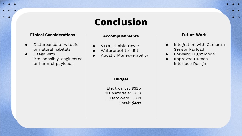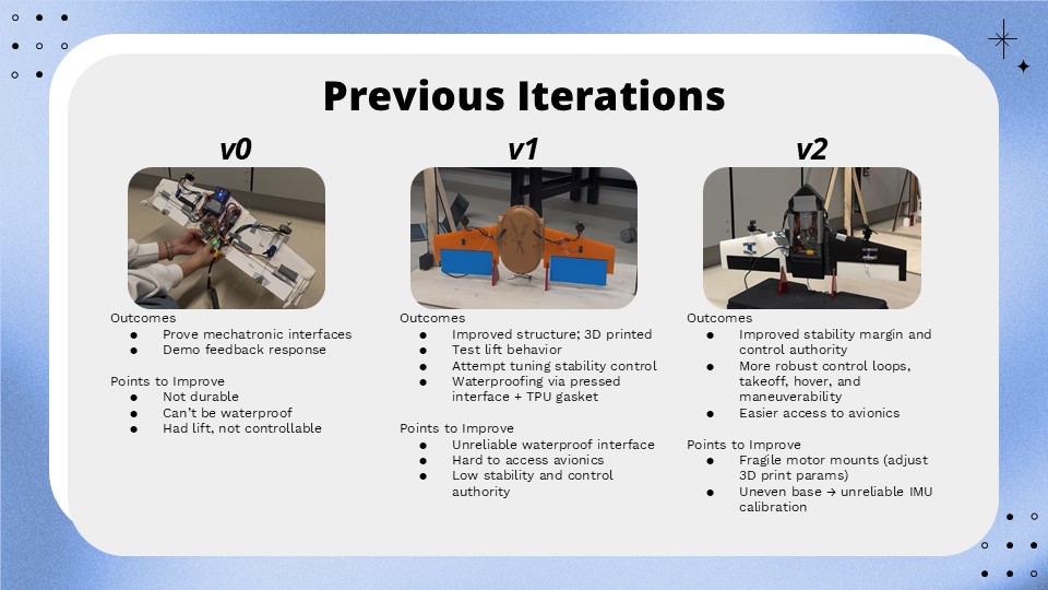 This report introduces AquaBorea, a bicopter tail-sitter drone that is capable of both flight and underwater maneuverability. As a tail-sitter, AquaBorea has vertical take-off and landing (VTOL) with forward-flight capabilities in both in air and in water. This drone will have the benefits of a quadcopter in its hover mode while having the maneuverability and long-distance efficiency of any other fixed-wing aircraft. We describe the design of AquaBorea and provide both a real model as well as a CAD rendering. In this report, we also develop a model of AquaBorea in aerial situations and determine suitable control laws in this situation. We also demonstrate the potential of our model to fly, proven by thrust curves and calculations based on thrust equations. Further, the electronics and feedback control have been implemented and tested.