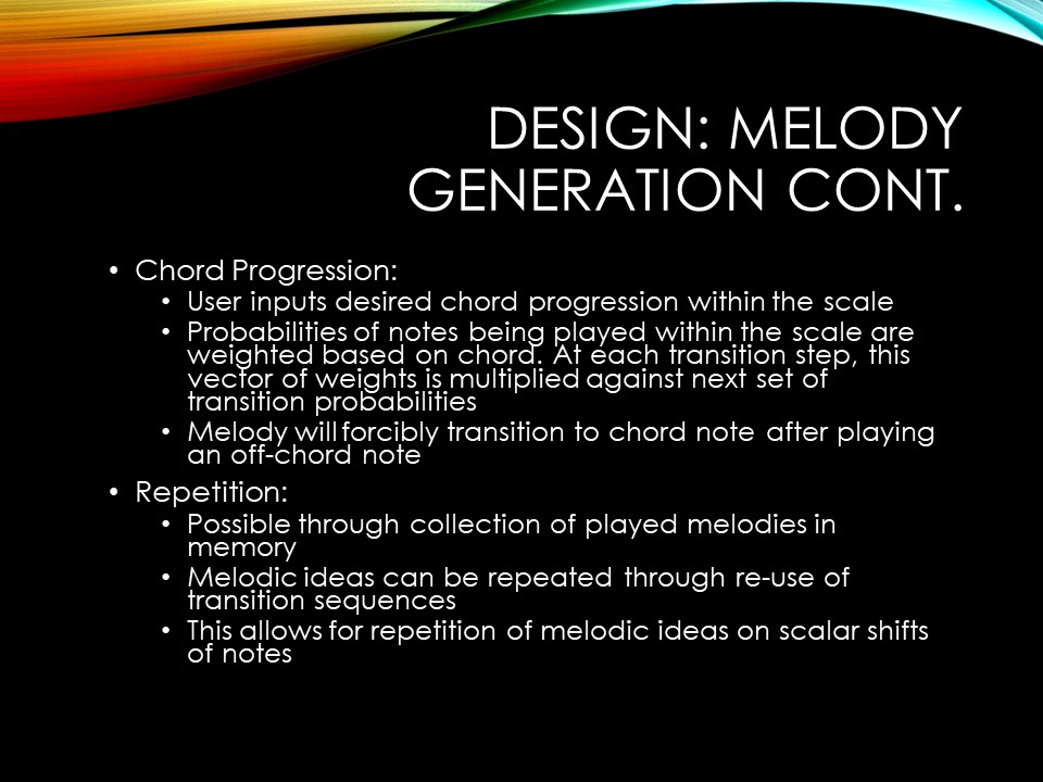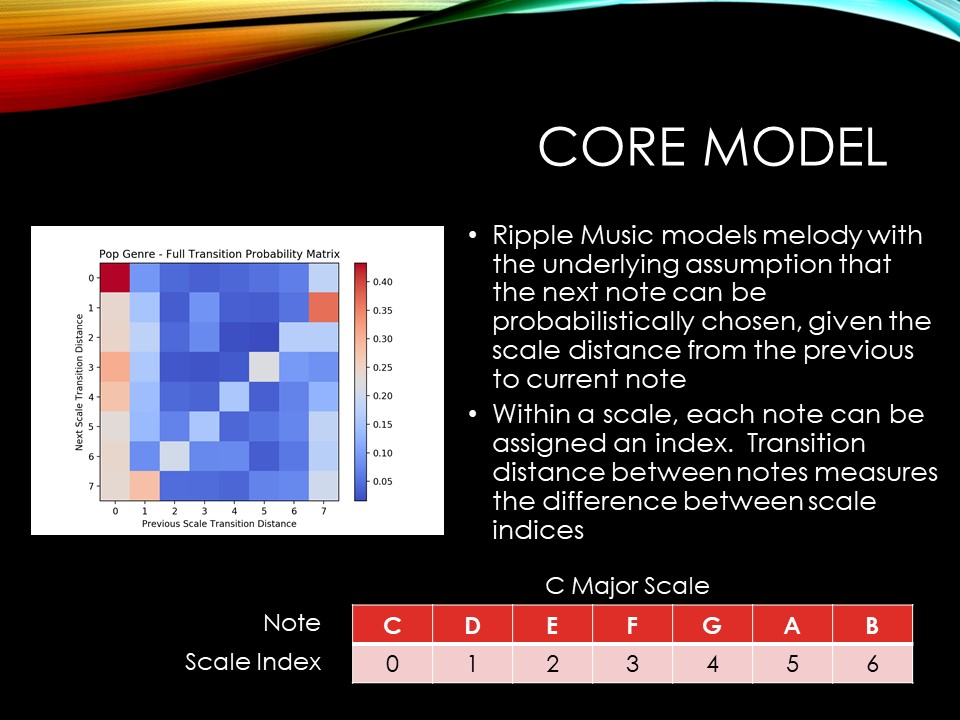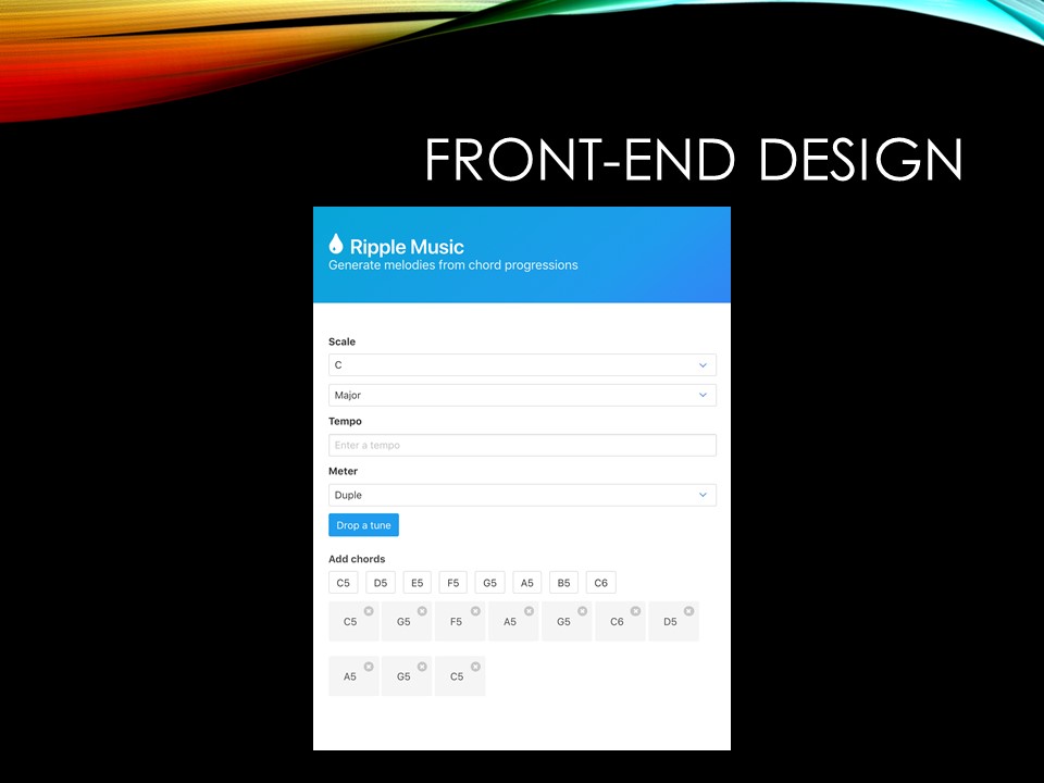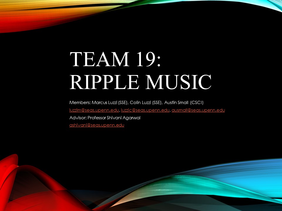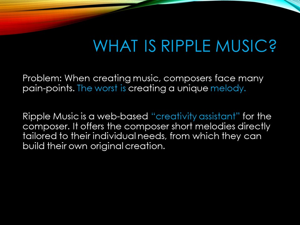 One of the most challenging aspects of composing music is the creative process of developing a melody. Finding the right melody is often difficult and it is primarily the first step that is made when creating a new song. Ripple Music is a software application that attempts to make this first step of melody creation more accessible to composers. We have made it such that an original melody can be generated by a computer with the press of a button. Users can change basic inputs such as chord progressions, tempo, key, and metre in order to find a melody that best fits their musical style. With MIDI compatibility, composers can even play these new melodies through their keyboards, giving them the ability to play along with harmonies and accompaniments. Ripple Music makes composing more approachable for amateur composers and it can help alleviate writer’s block or just simplify the process for those who are more experienced.