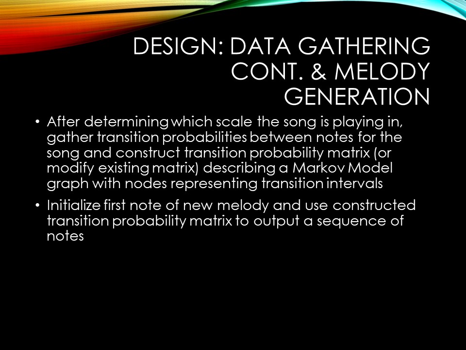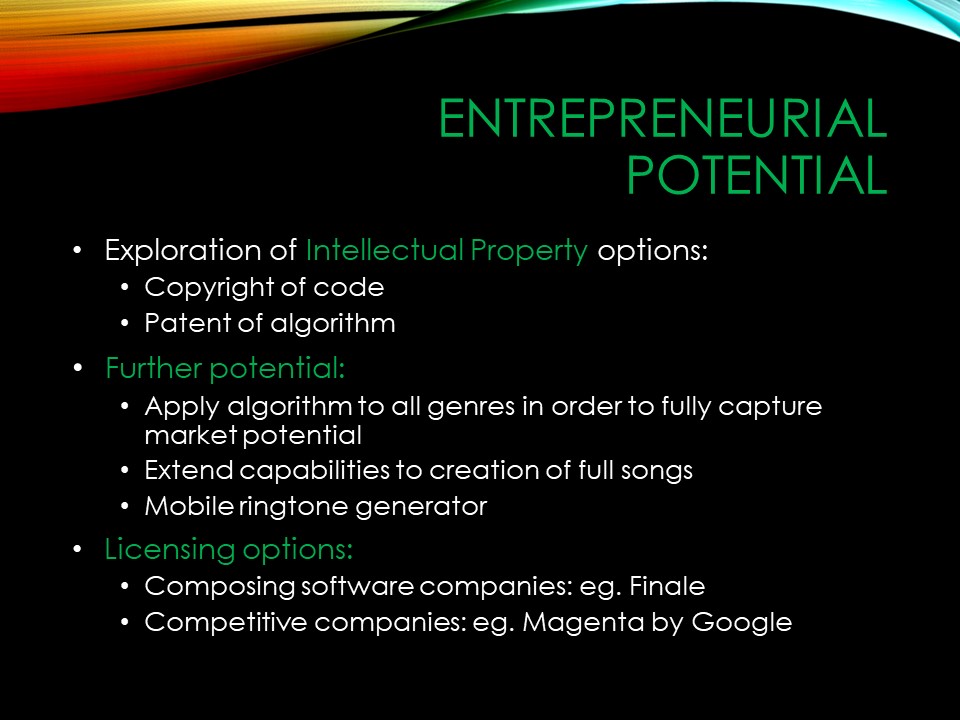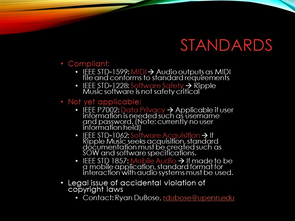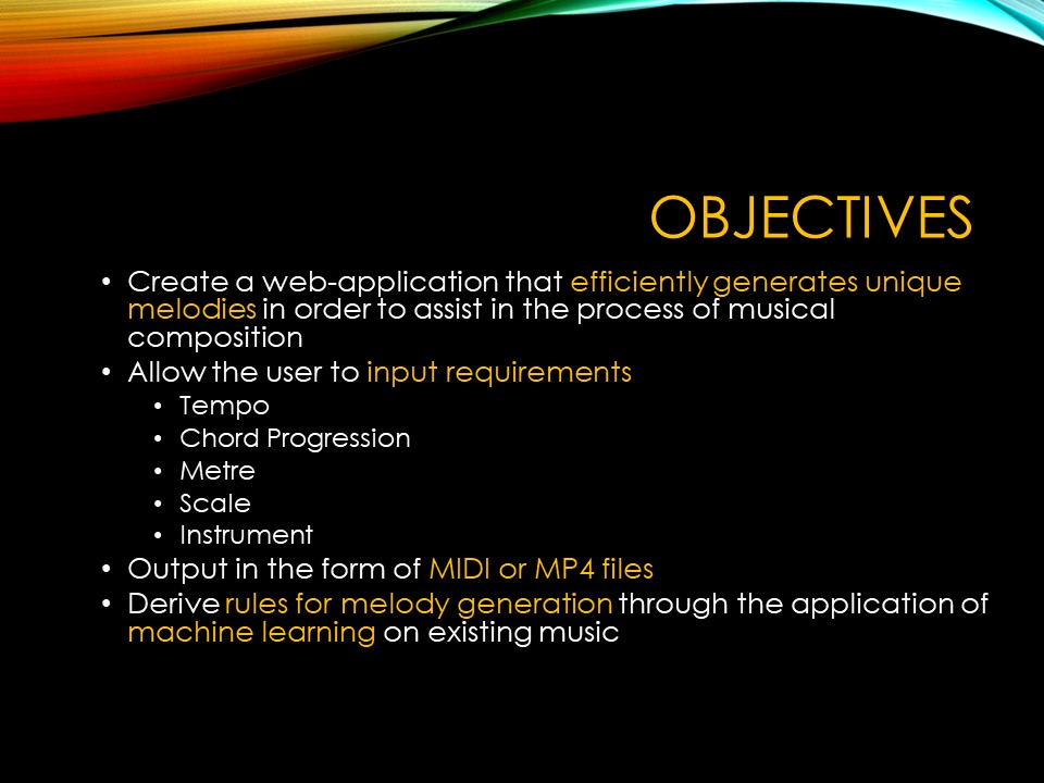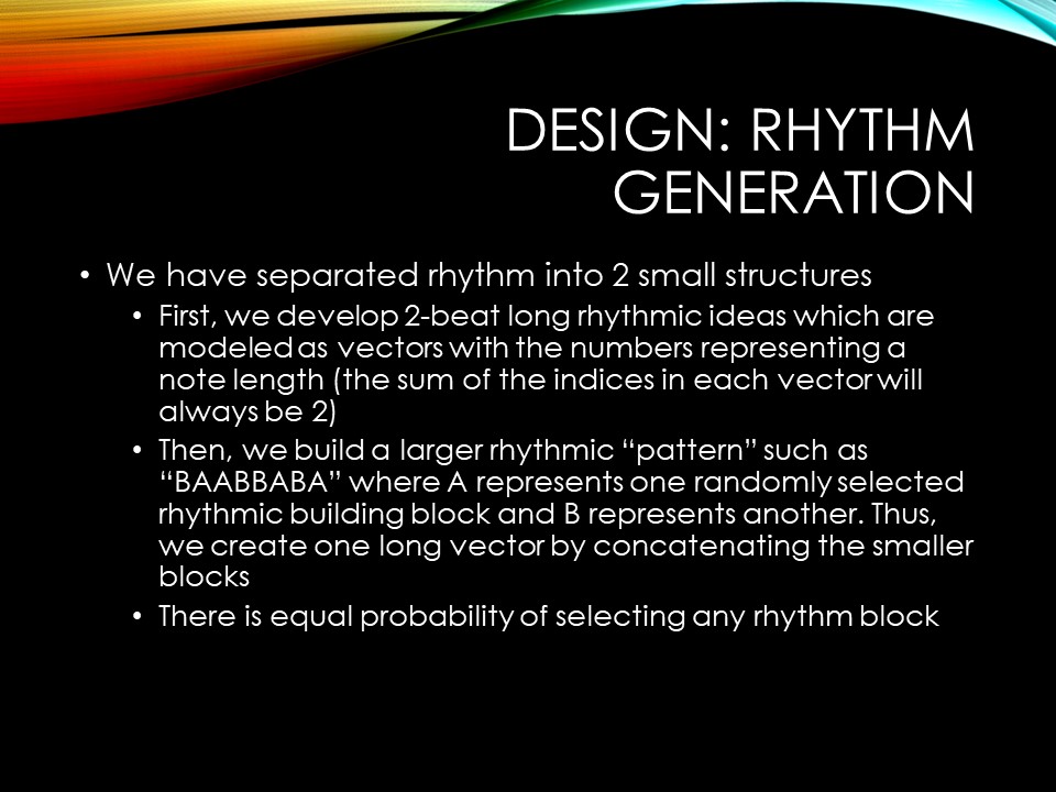 One of the most challenging aspects of composing music is the creative process of developing a melody. Finding the right melody is often difficult and it is primarily the first step that is made when creating a new song. Ripple Music is a software application that attempts to make this first step of melody creation more accessible to composers. We have made it such that an original melody can be generated by a computer with the press of a button. Users can change basic inputs such as chord progressions, tempo, key, and metre in order to find a melody that best fits their musical style. With MIDI compatibility, composers can even play these new melodies through their keyboards, giving them the ability to play along with harmonies and accompaniments. Ripple Music makes composing more approachable for amateur composers and it can help alleviate writer’s block or just simplify the process for those who are more experienced.