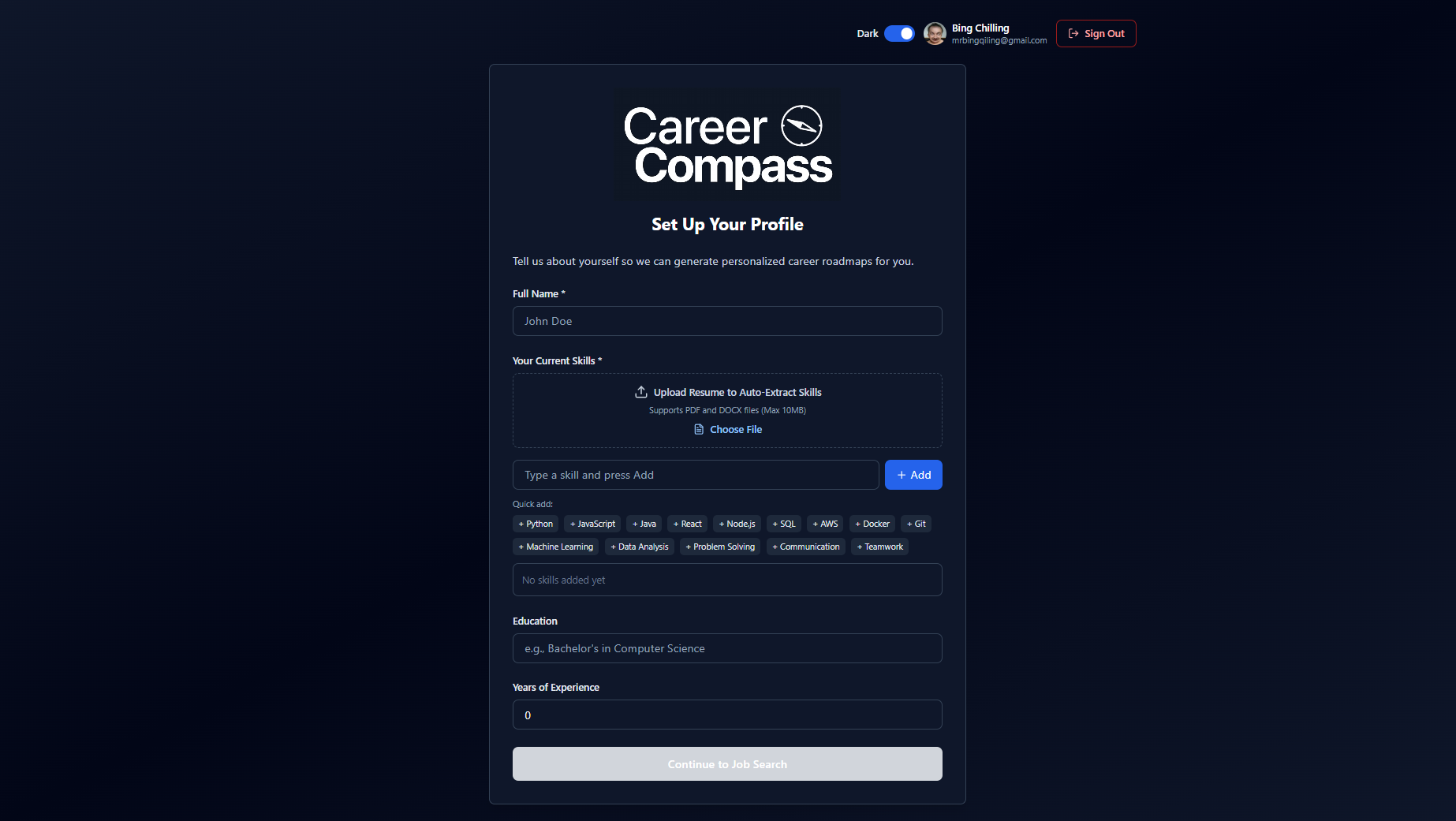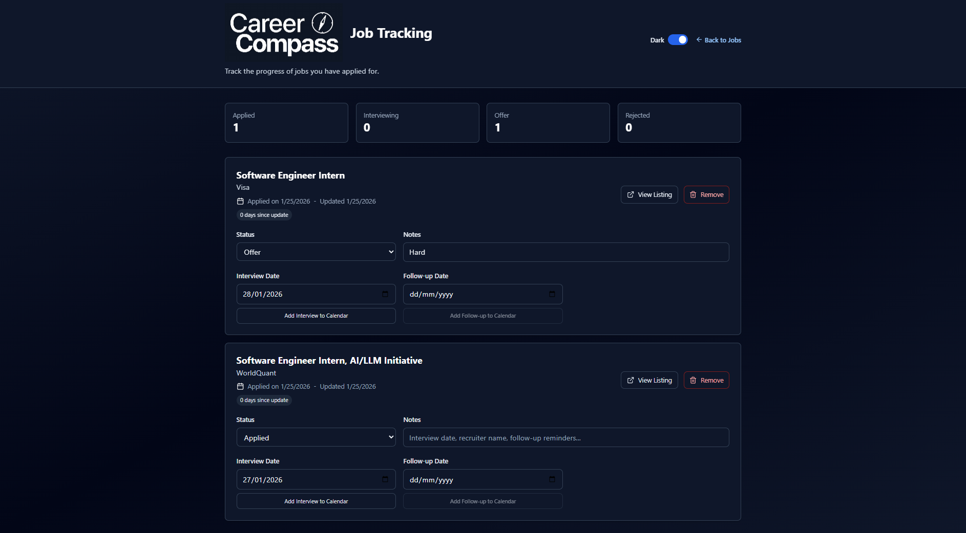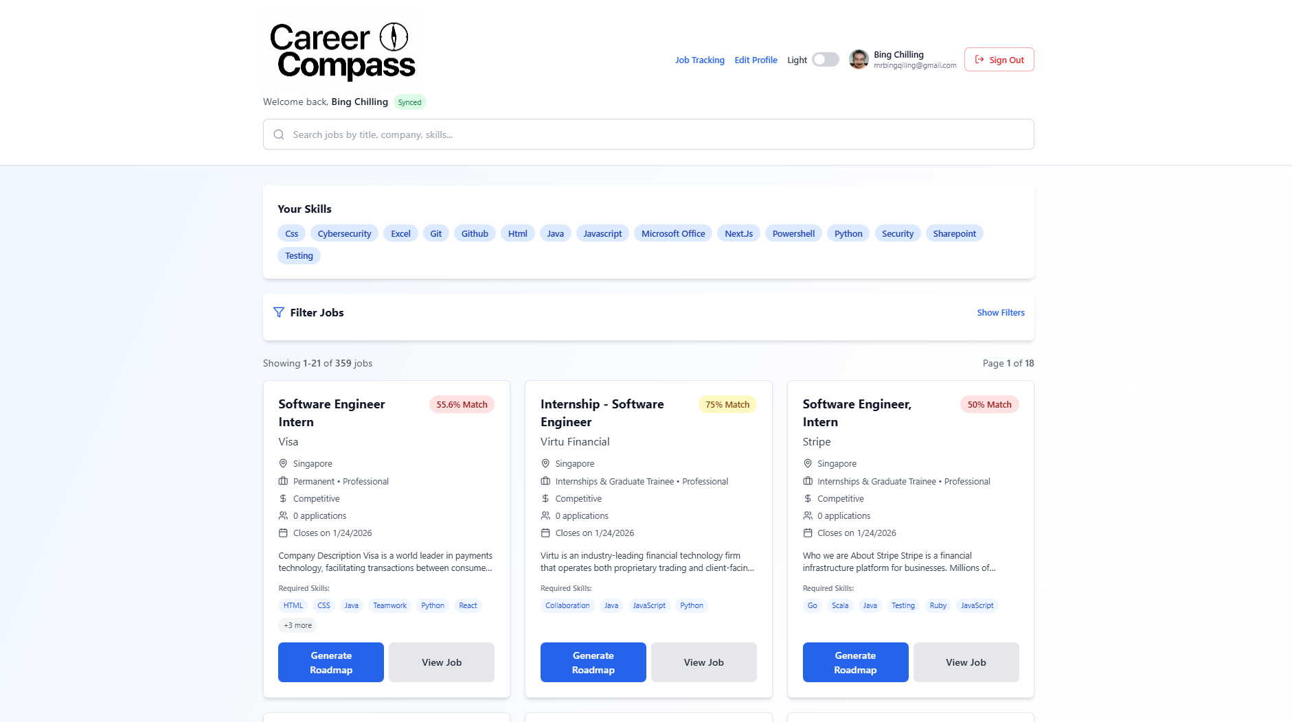 CareerCompass pulls job listings, matches them to a user’s skills, and generates a personalized roadmap. It also helps track applications, follow‑ups, and interview/follow‑up calendar reminders.