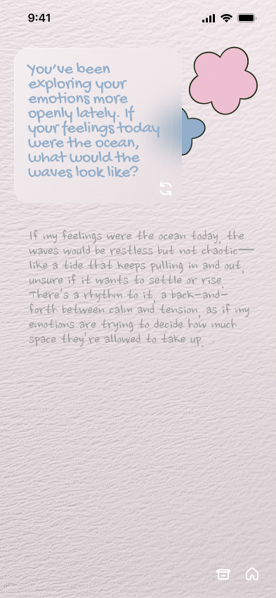 - Describe your most important design decisions. What research findings and/or user testing results led you to make these decisions? (Max 500 words) Write your answer here. Our team wanted SeekDeep to be a very calming and welcoming environment. Therefore, we chose to use hand-illustrated features to create a cozy atmosphere, rather than a sleek and cold-feeling design. Another key aspect of our design is the navigation. We want the user to explore the app environment leisurely, taking them at their own specific pace and promoting fun. We included a breathing exercise, mood tracker, journal, and an analytics page, all tied together in a cozy illustrated style. These key features were decided upon by being mindful and deliberate with the surveys that showed our participants would increase their journaling habit for the attractive features of gamification and mood tracking. These were all important elements to us because we wanted to create a tool that can ground the user, and help to get them in touch with their emotions. We looked into competitor apps on the market including Clearful-Journal and Diary, Stoic. Journal and Mental Health, and Reflection Journal & Prompts. These apps' most common features are journal prompts, capturing photos, and looking back on past entries. We wanted to make SeekDeep stand apart by including more gamification and focus on self reflection rather than AI just being an extra feature. SeekDeep records journal entries and emotions, then uses the data to find patterns in the user's emotions and personalising journal prompts. We also wanted to include a drawing feature as a tool for emotional grounding rather than a photo capture. We believe that this brings the user to be more in touch with their physical surroundings, and can even help to relax them. Ultimately, these designs were heavily and consciously influenced by the prompt of remaining human in the age of AI. We wanted to use AI as a tool to become more in touch with oneself, and purposely hold up a mirror, so users can feel more comfortable and confident in themselves.