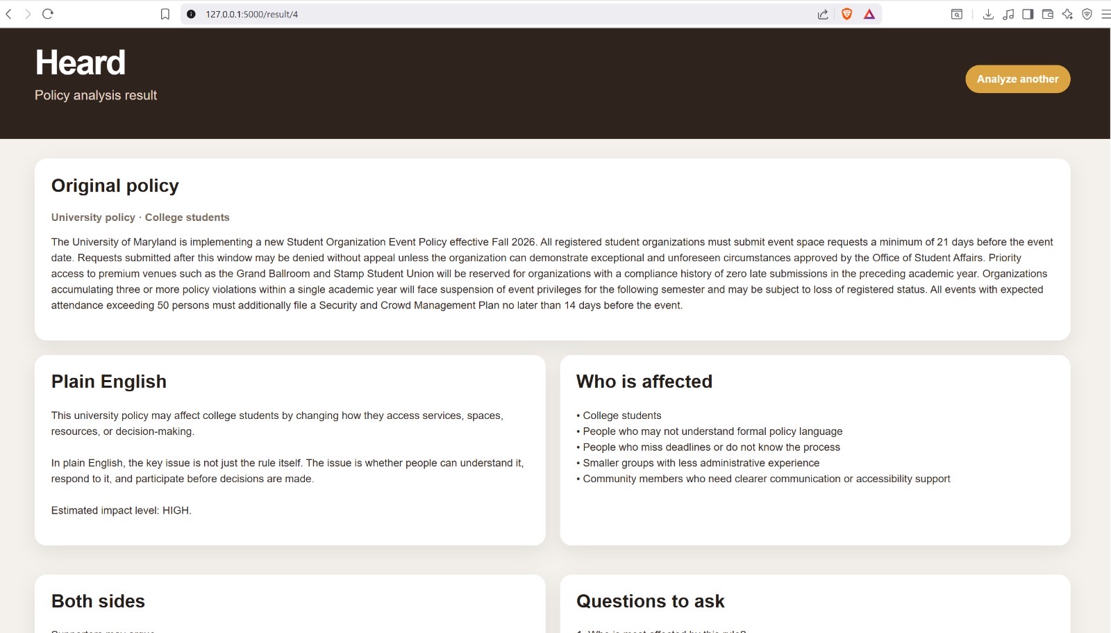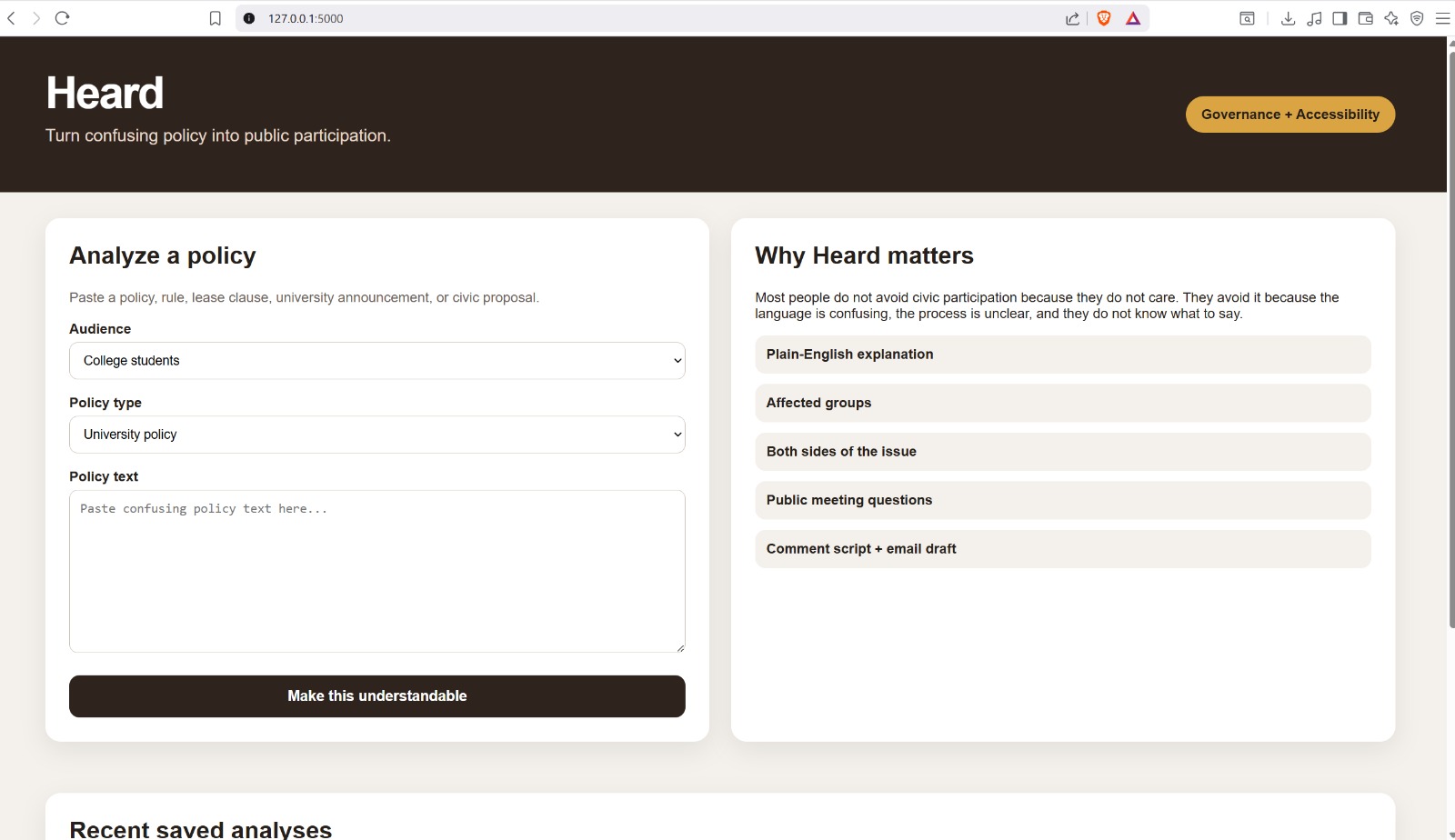 Heard was built to fix that. Inspired by Anthropic CEO Dario Amodei's essay Machines of Loving Grace — which envisions AI strengthening democracy — we asked: what if AI could give every ordinary person the same civic confidence that lawyers and insiders already have?