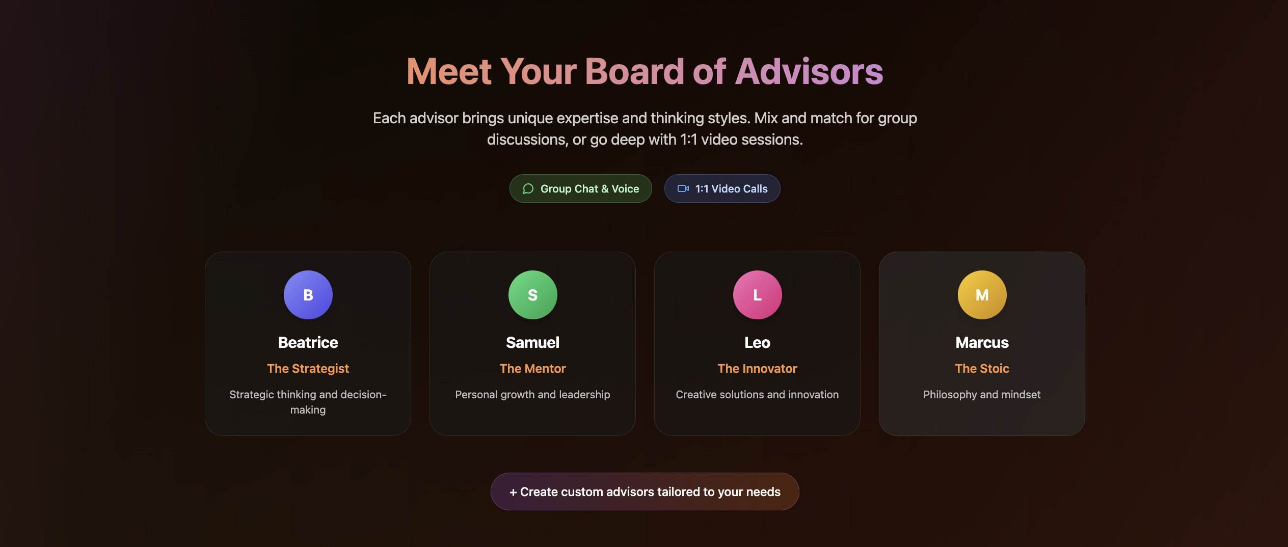 - Build Your Own Board: Users aren't limited to our defaults. They can create and refine their own custom advisors, which are automatically assigned unique voices and personas, ensuring a truly personalized experience.
