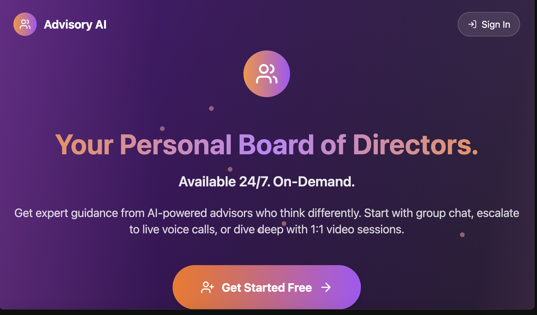 AI Advisory Board is your on-demand council of experts. It's a multi-modal AI platform where you can tackle your toughest decisions by engaging with specialized personas through group chat, live voice calls, and 1:1 video sessions.