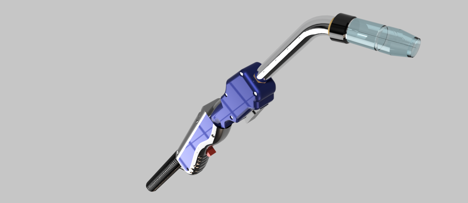 We searched for a common and versatile welding torch used in the industry, the Miller MDX-250, and designed a handle and nozzle around our model of the the torch.