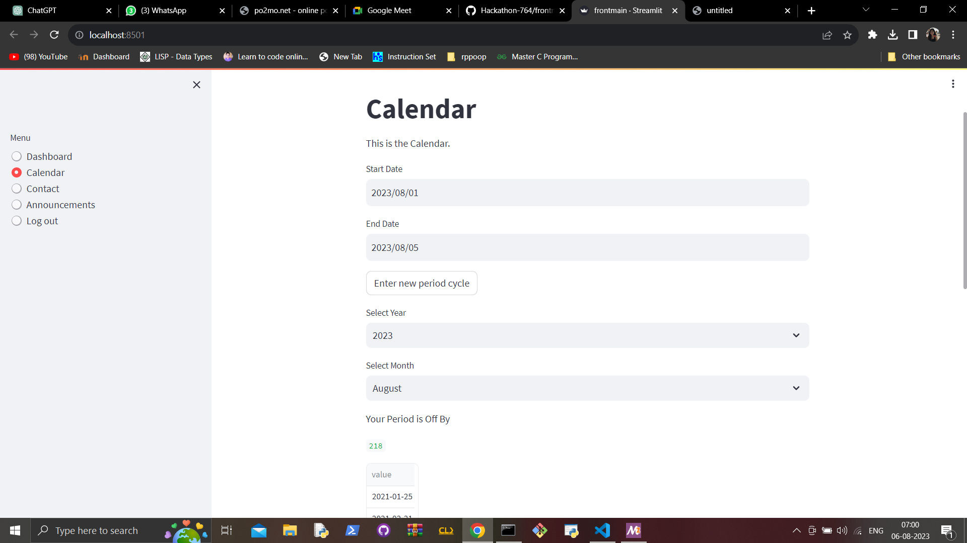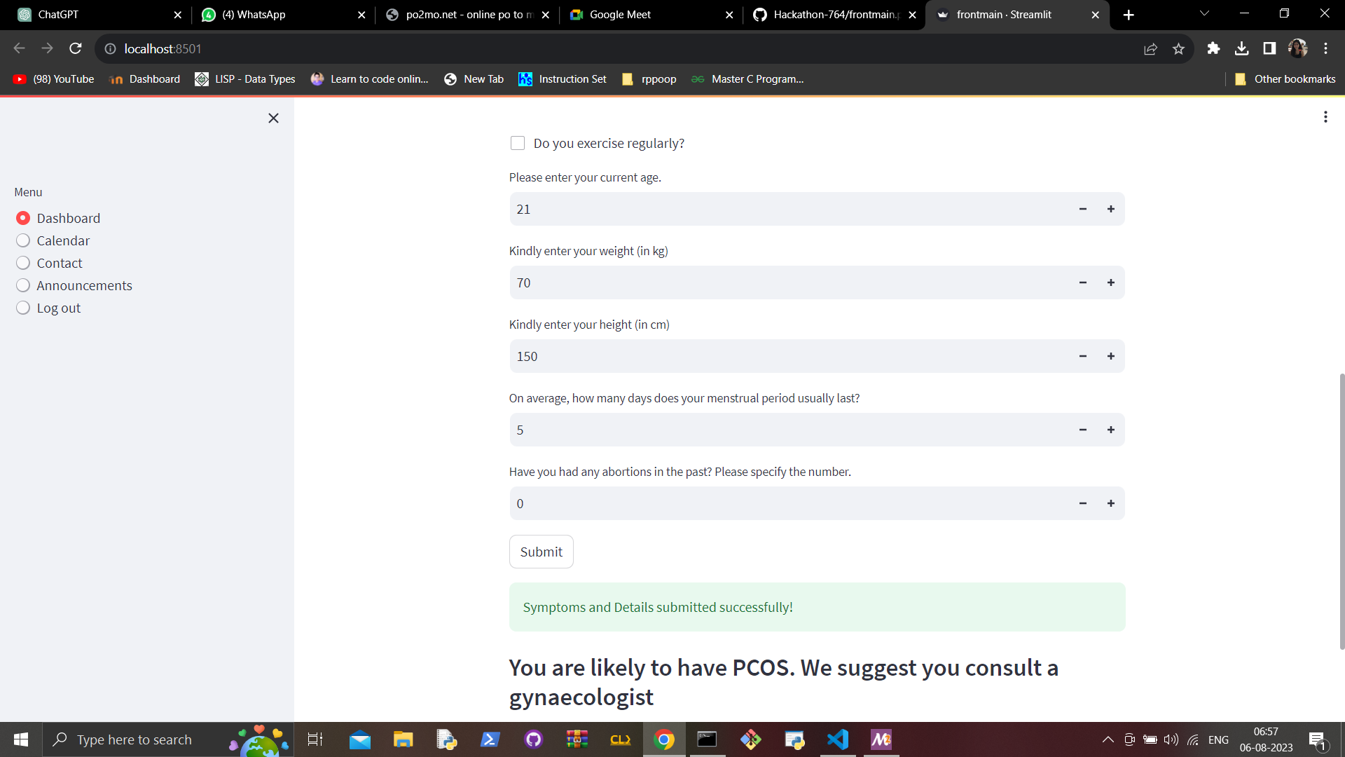 We started by making a linear regression model for period cycle prediction. We then made a classification model for PCOS. Next we connected these models to the frontend which was made in StreamLit.