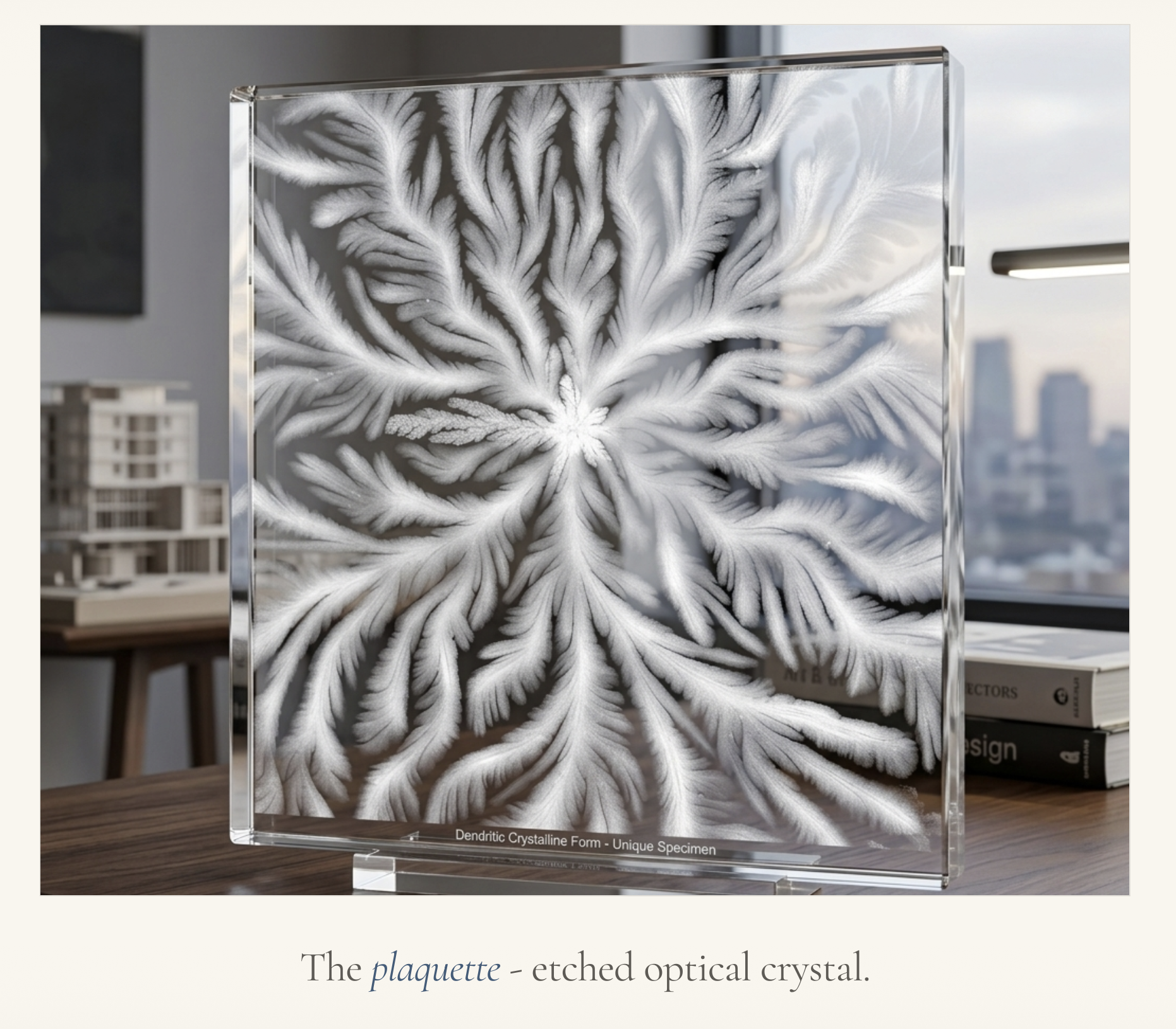 - A keepsake — the same dendritic pattern gets imprinted onto everyday objects (an etched optical crystal plaquette, a glazed ceramic plate, a laser-etched notebook cover) so tears of joy become something you can hold forever.