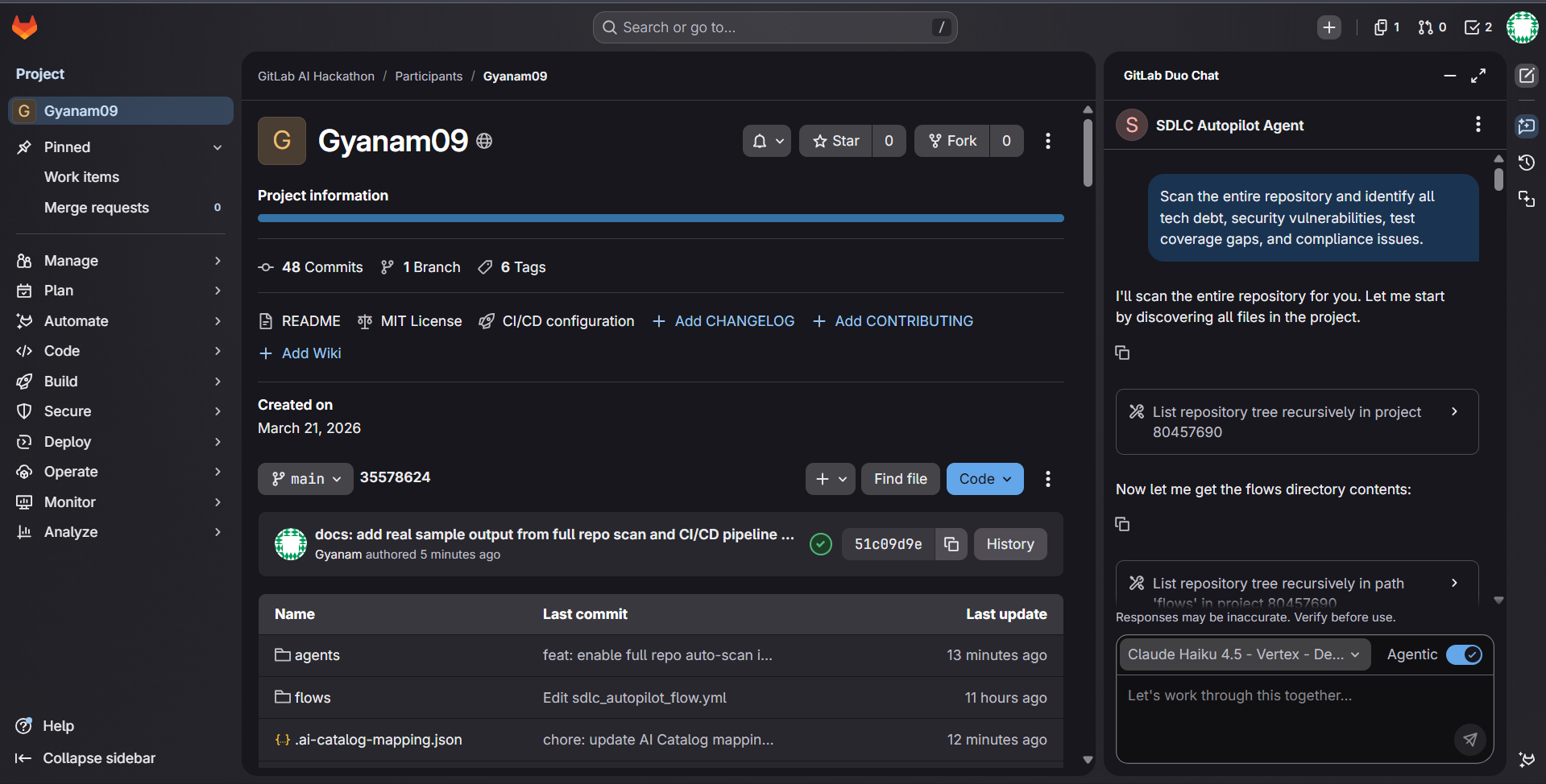 1. GitLab Duo Chat Agent — Chat directly with the agent and ask it to scan a single file or the entire repository. It automatically discovers all code files using list_repository_tree, reads them one by one, and produces a unified report covering tech debt, security vulnerabilities, test coverage gaps, and compliance violations — complete with a Project Health Score (0-100) and letter grade.