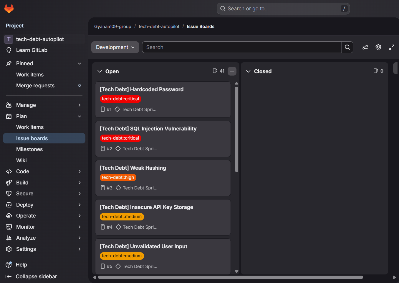 Auto-generated GitLab Issue Board — 41 prioritized issues created automatically with tech-debt::critical, high, medium, low severity labels