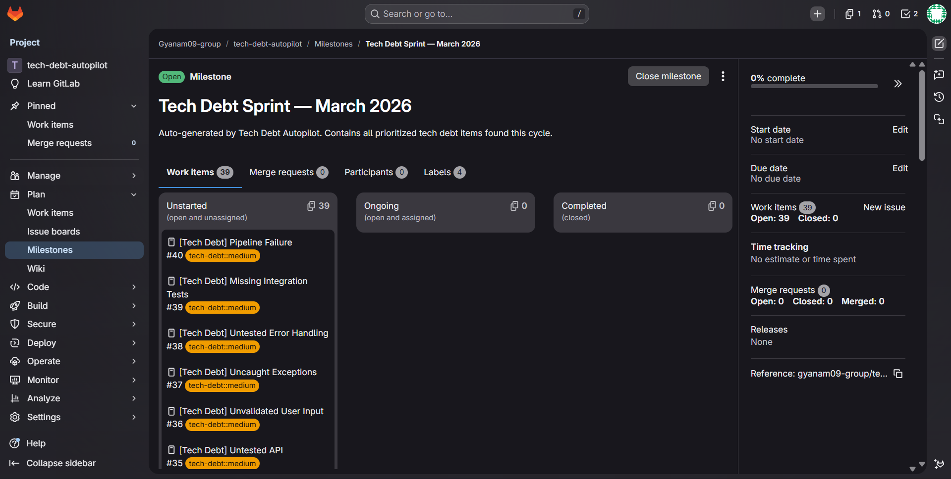 Tech Debt Sprint — March 2026 milestone auto-created by the pipeline with all prioritized issues grouped and labeled by severity