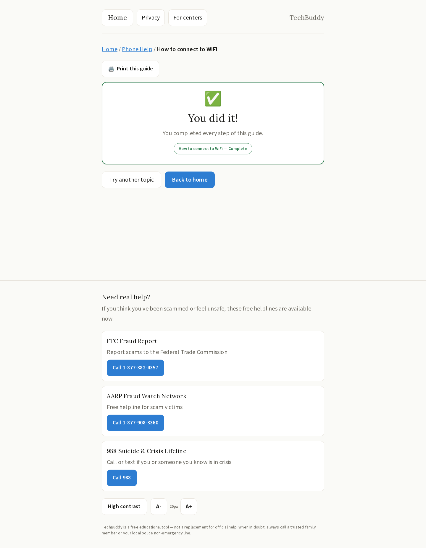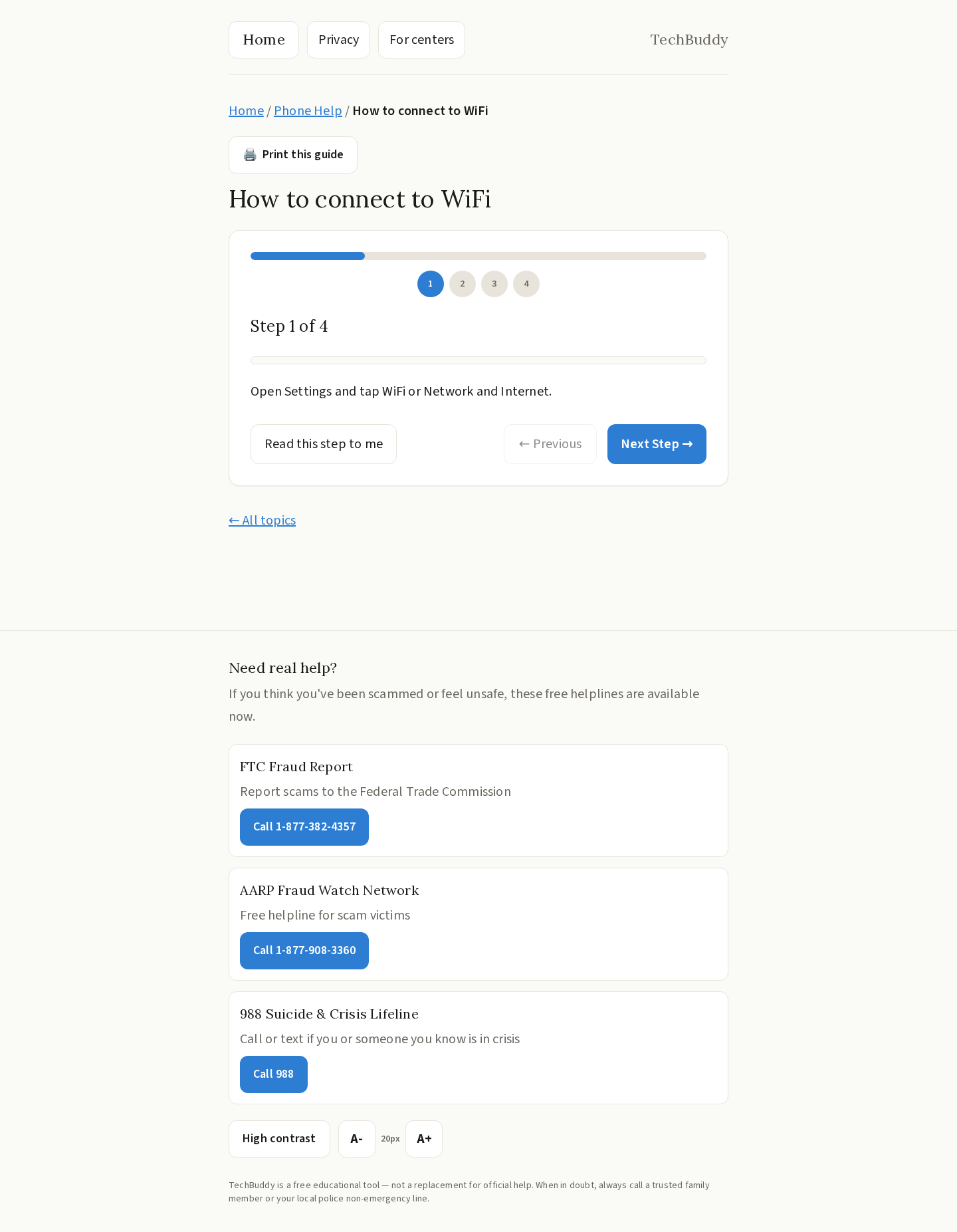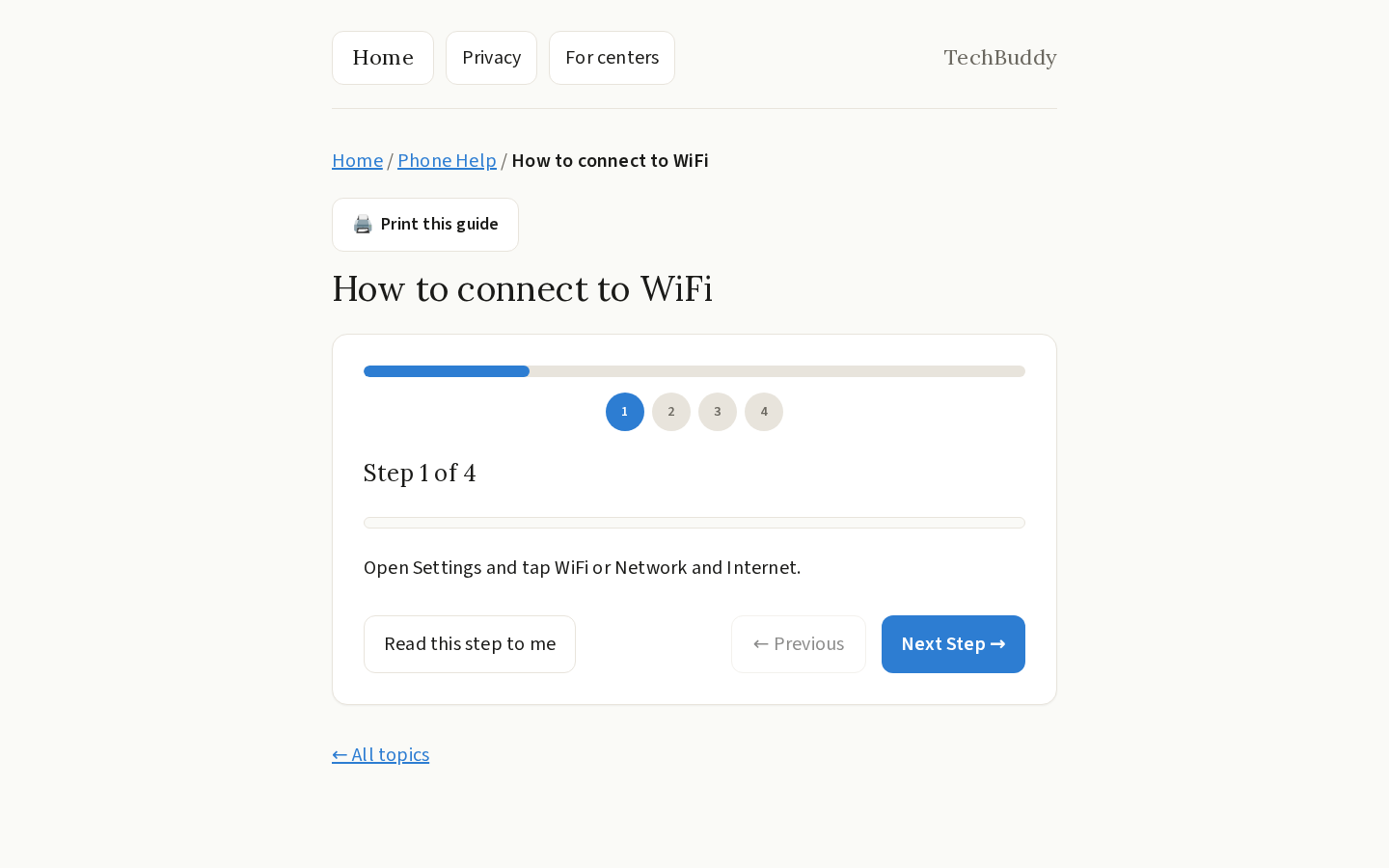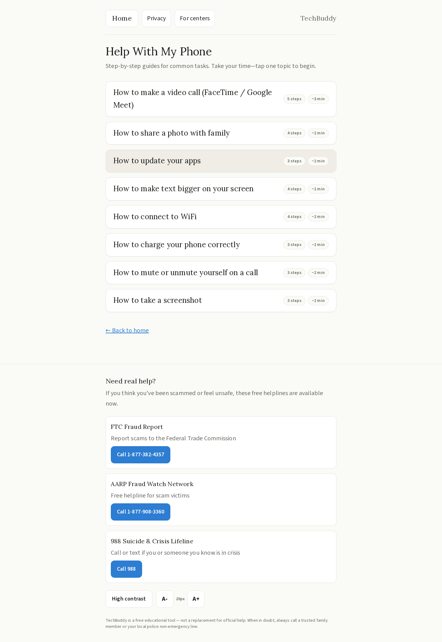 - Help With My Phone — Step-by-step guided walkthroughs for everyday smartphone tasks like making video calls, taking photos, connecting to WiFi, and taking screenshots.
