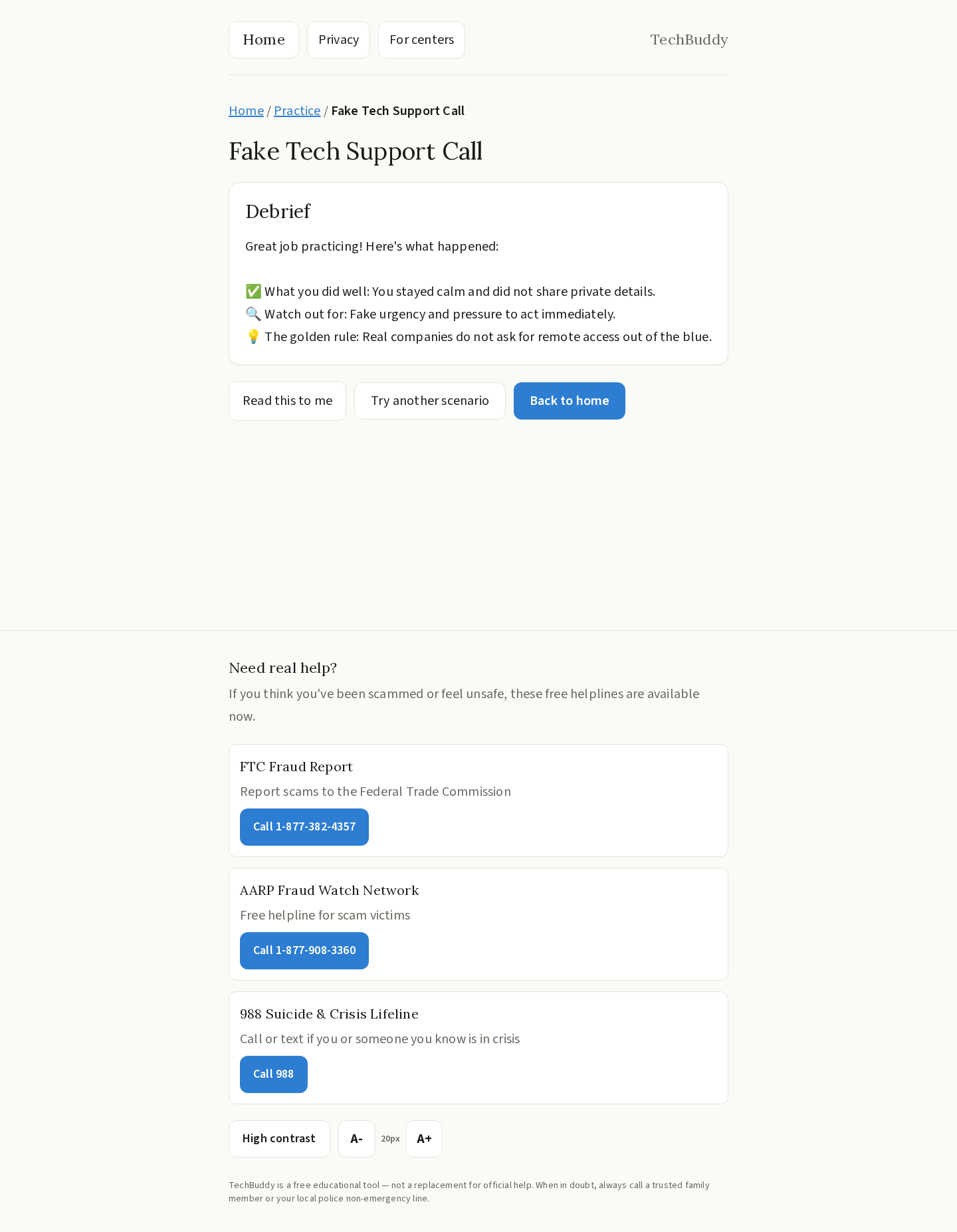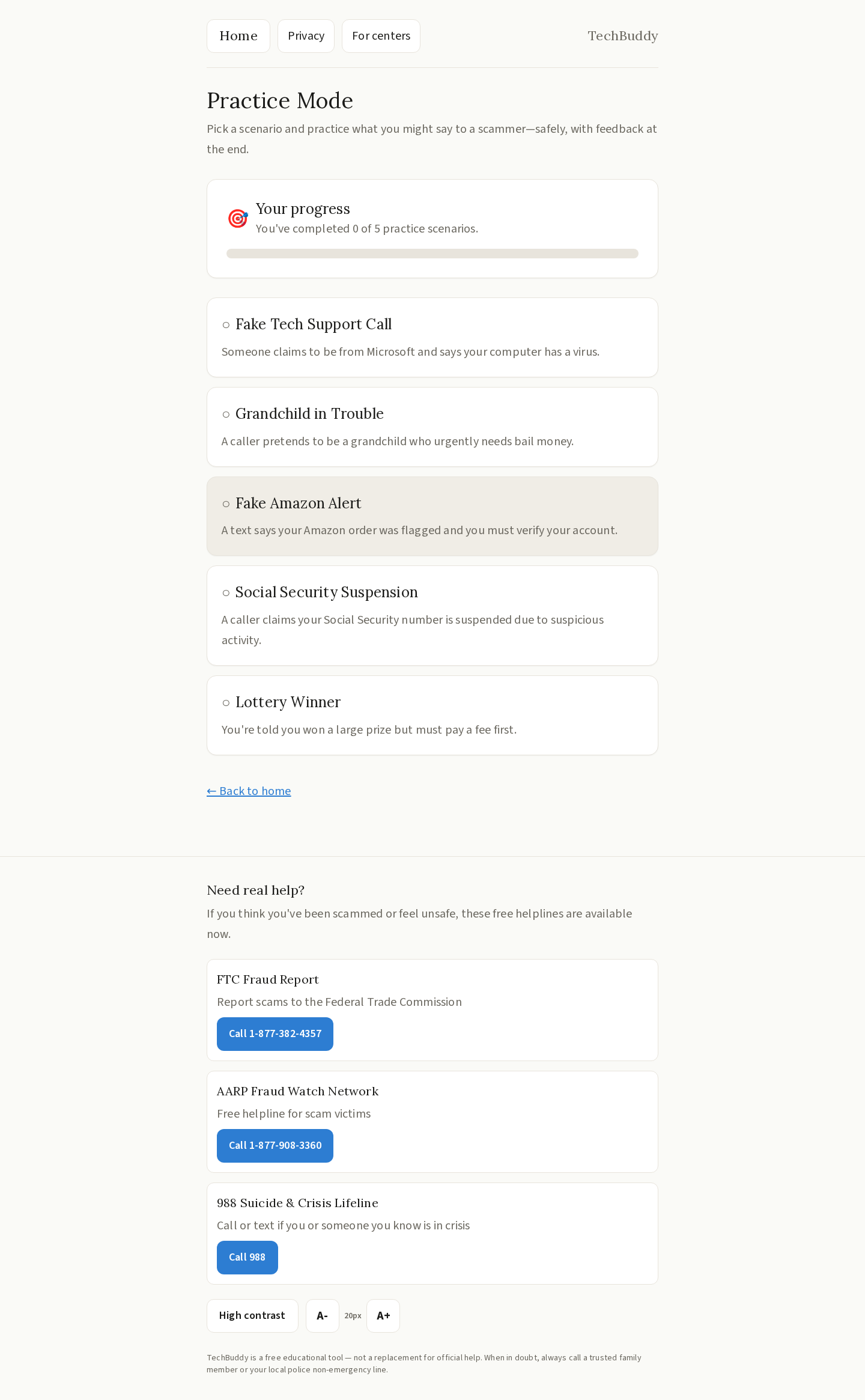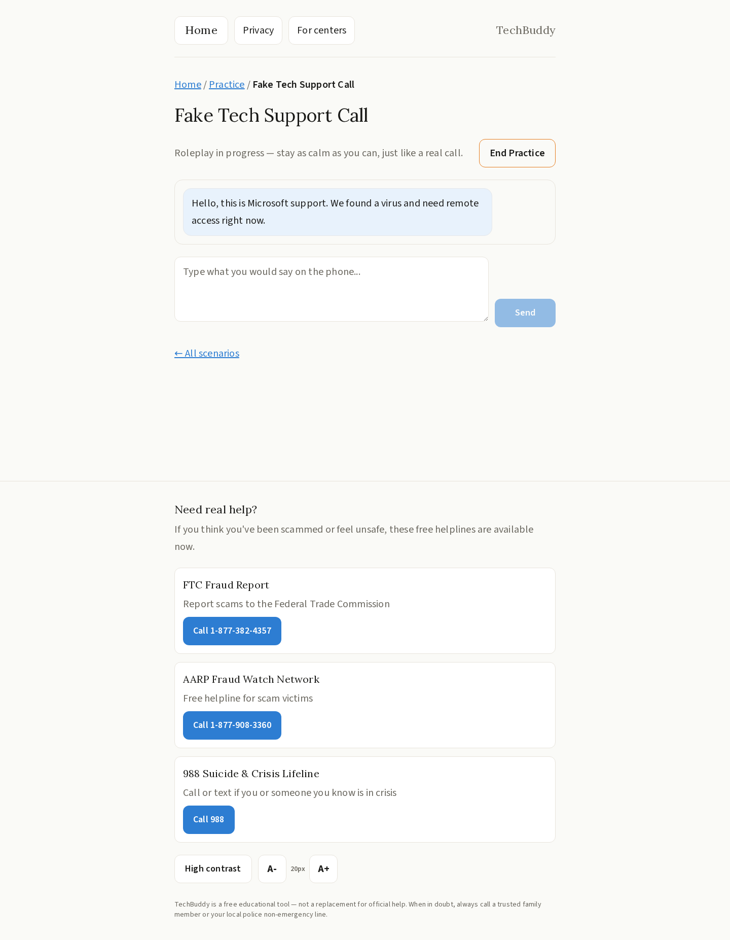 - Practice Mode — Safe roleplay scenarios against common scam scripts (grandparent scam, tech support fraud, etc.) with an encouraging debrief afterward.