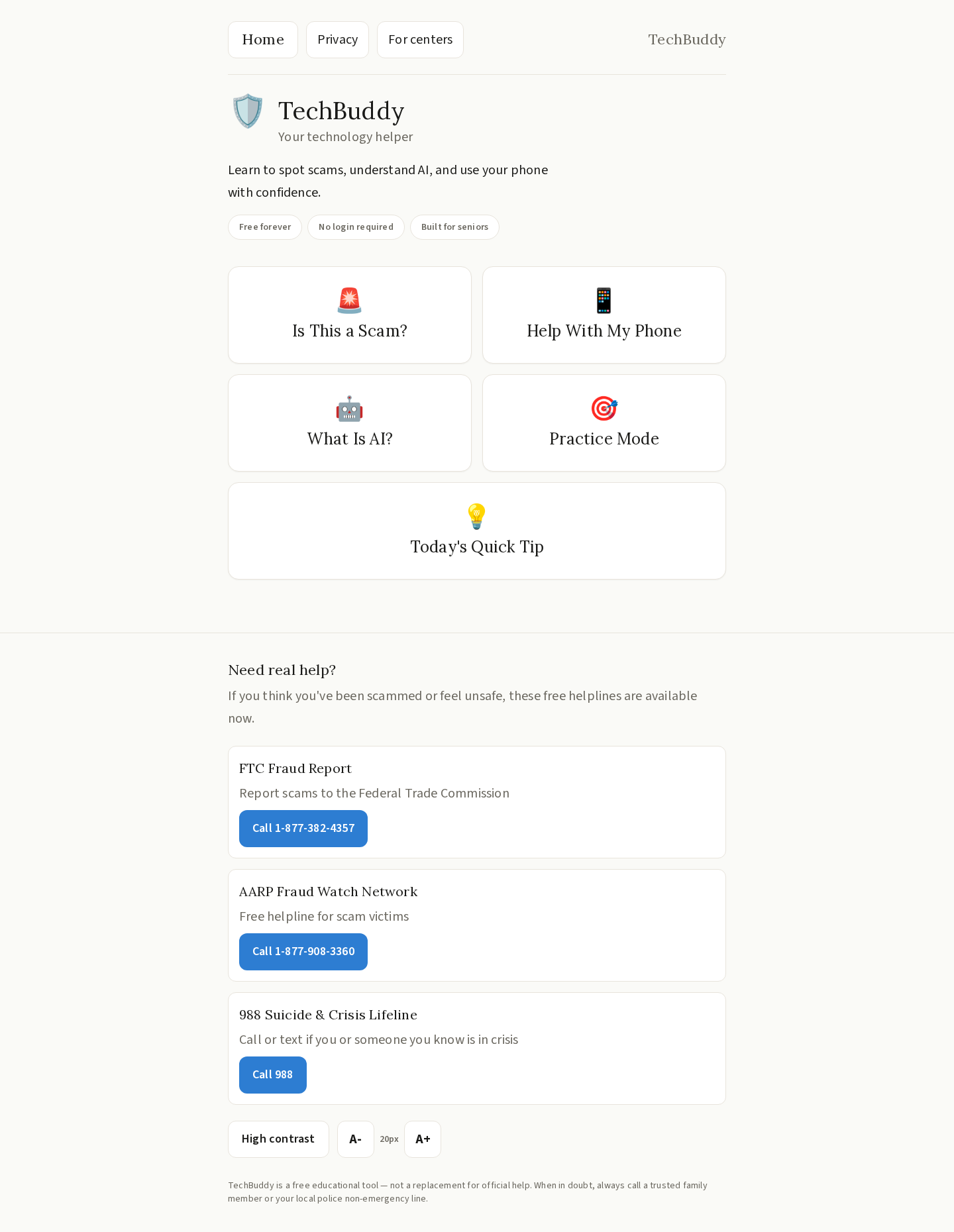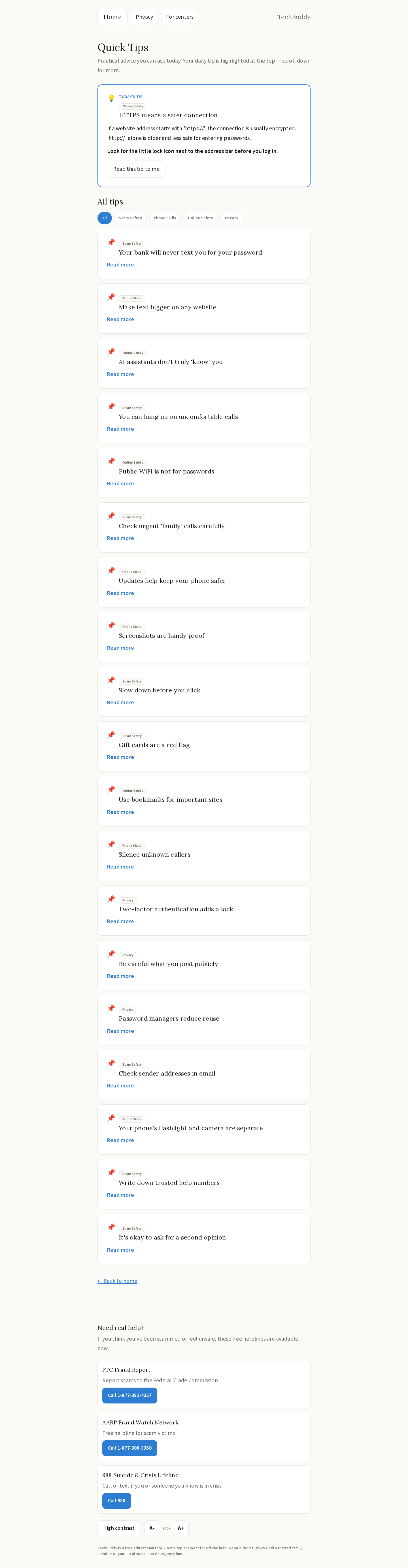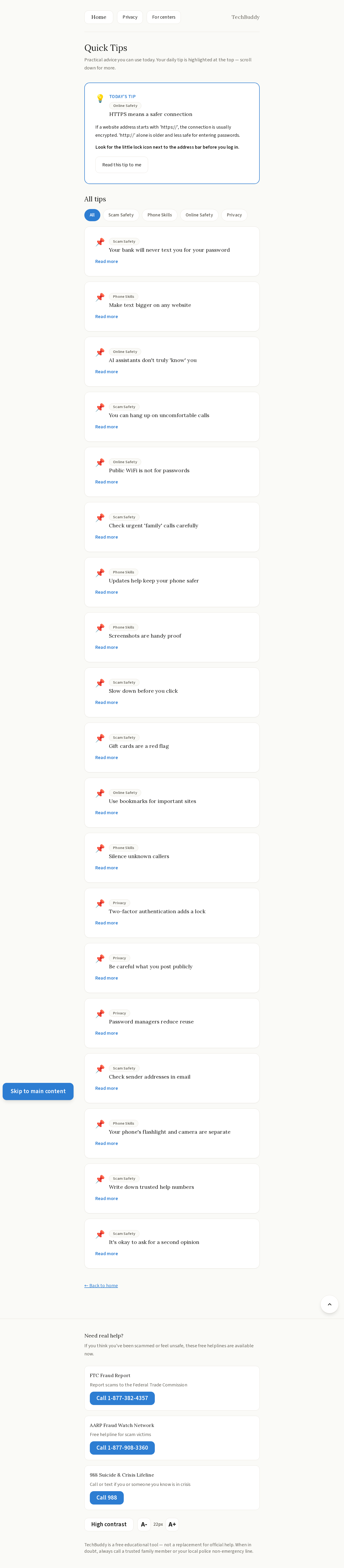 - Quick Tips — One digestible tip per day on device safety, privacy, and AI literacy.