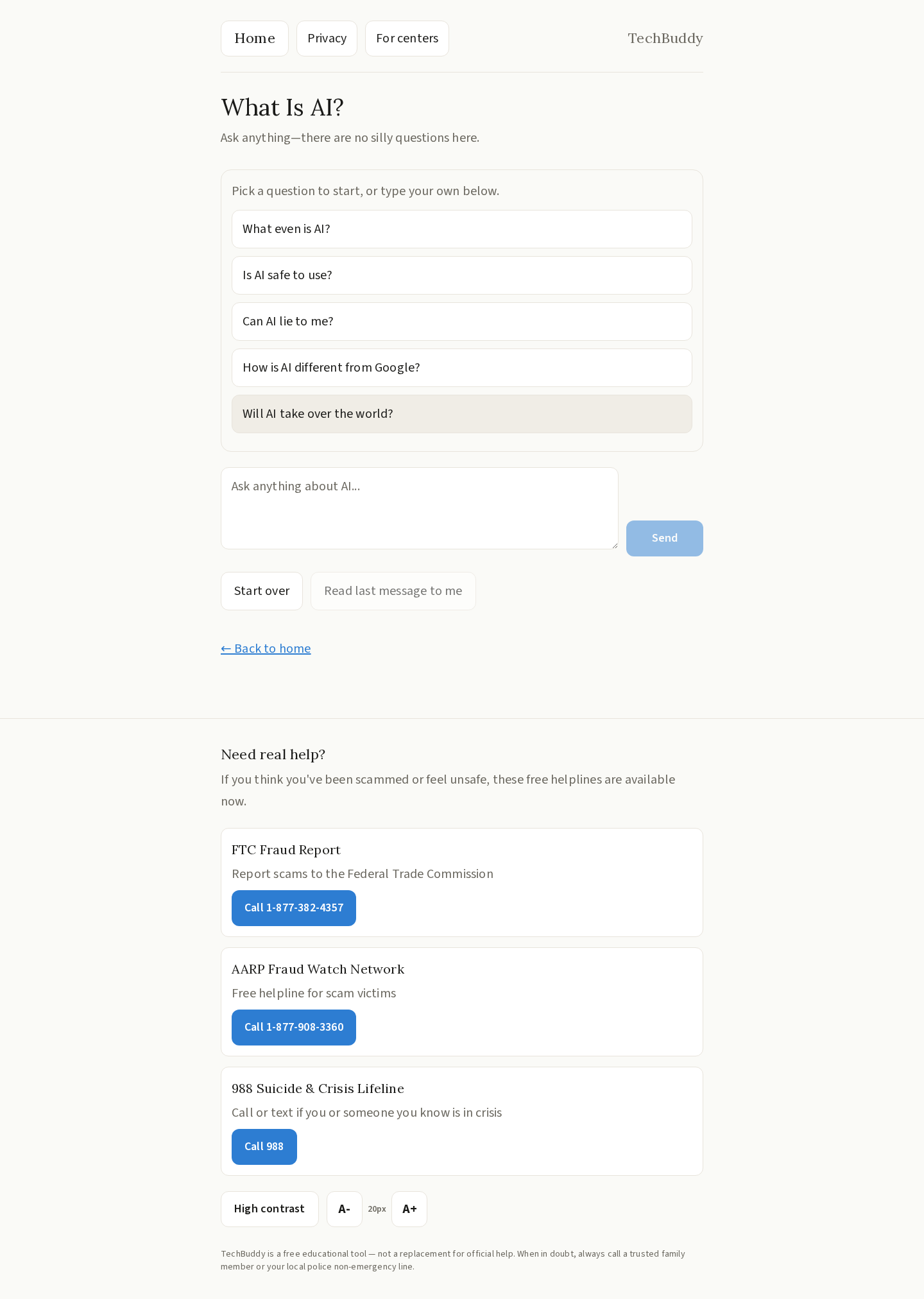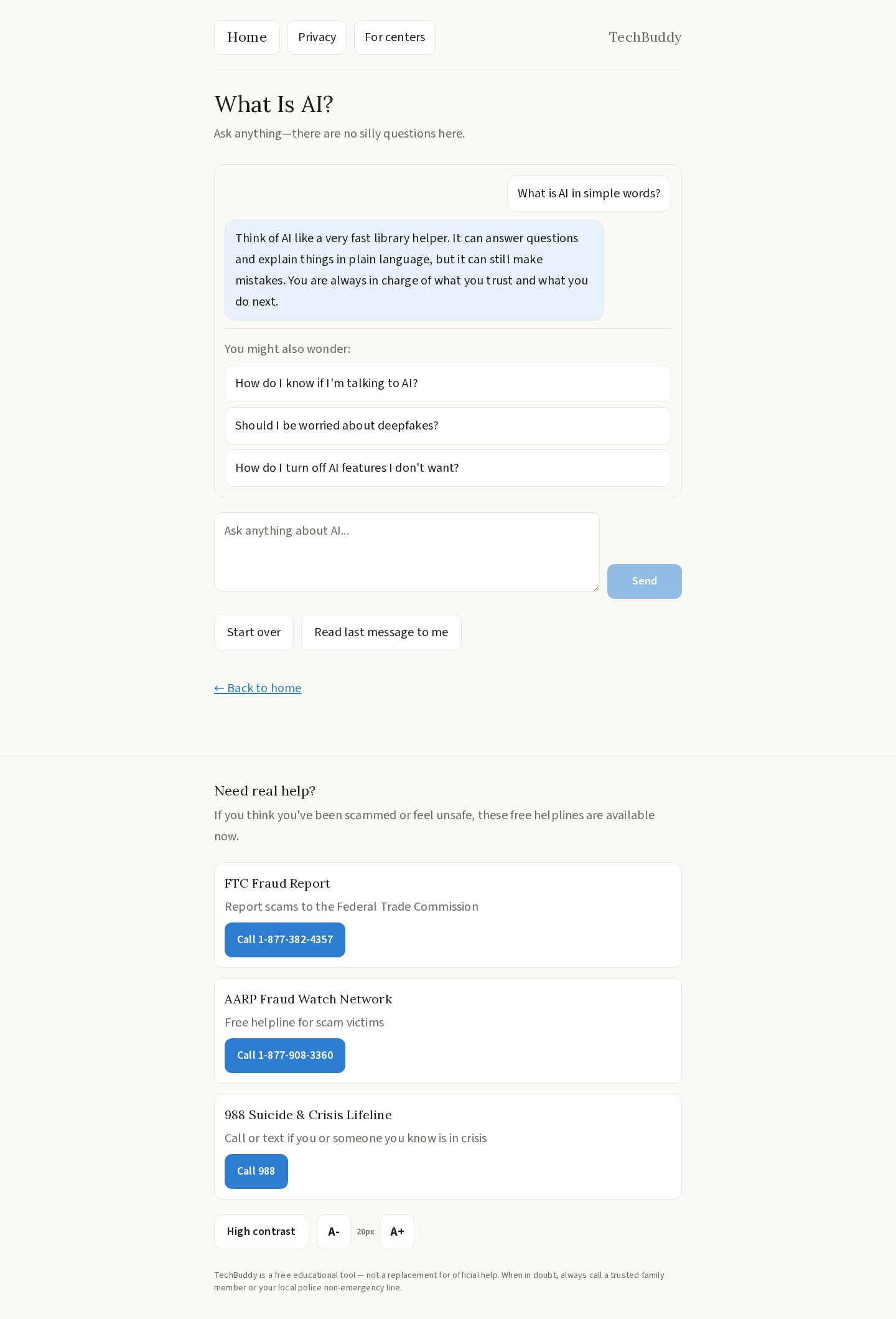 - What Is AI? — A friendly, no-jargon chat interface that explains artificial intelligence concepts at a comfortable pace.