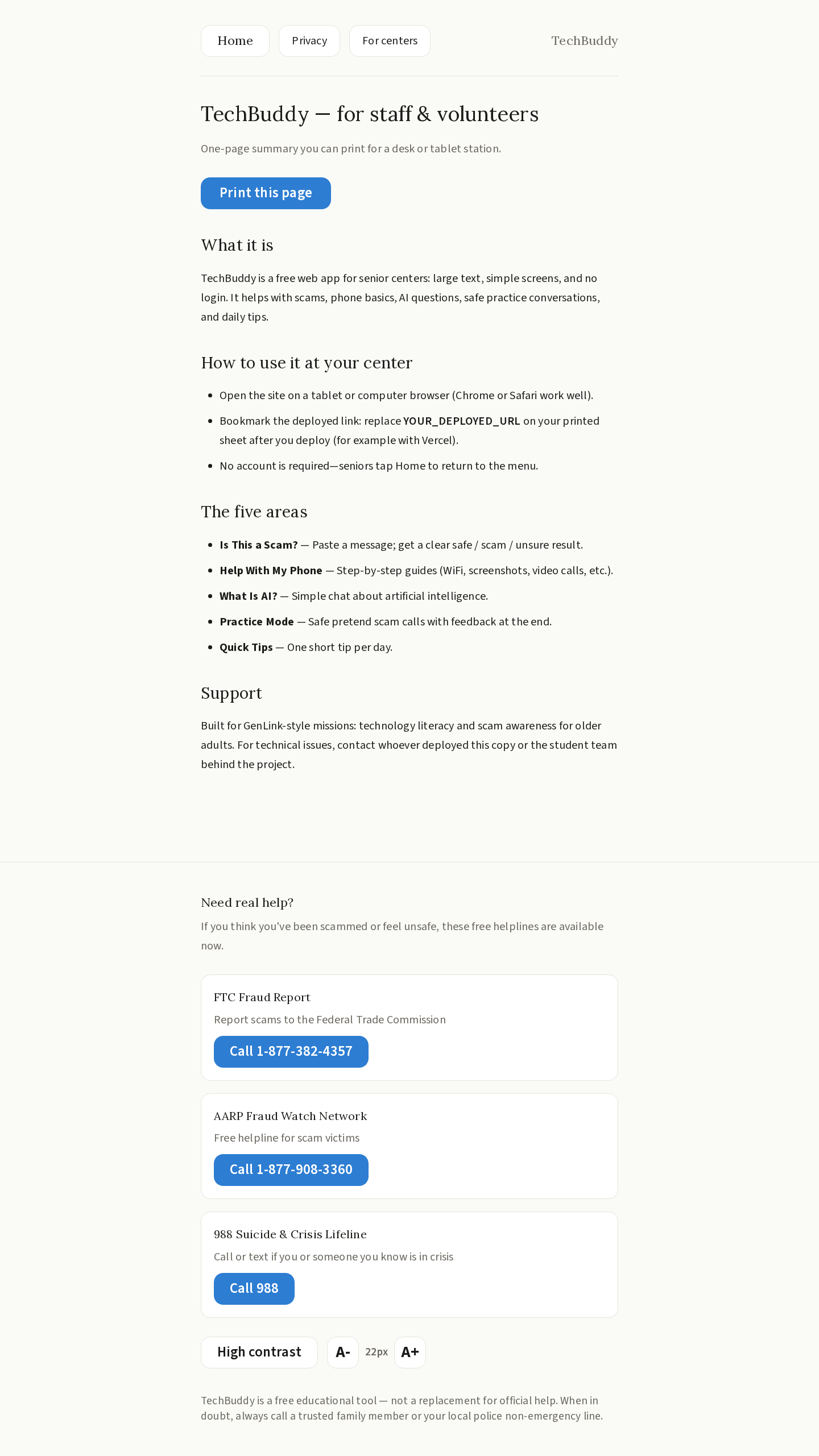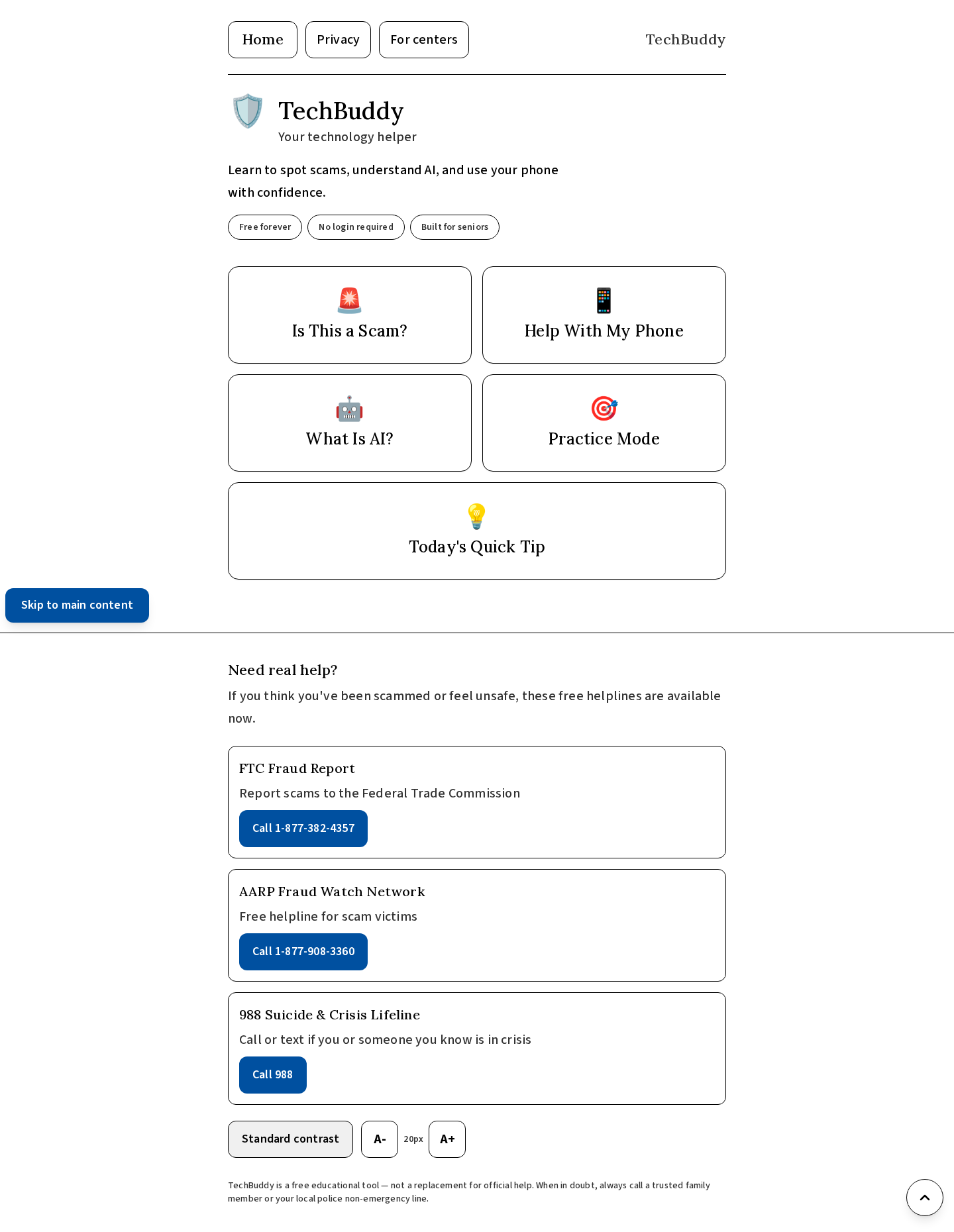 TechBuddy is a web app built specifically for senior citizens navigating modern technology. It offers five core features: