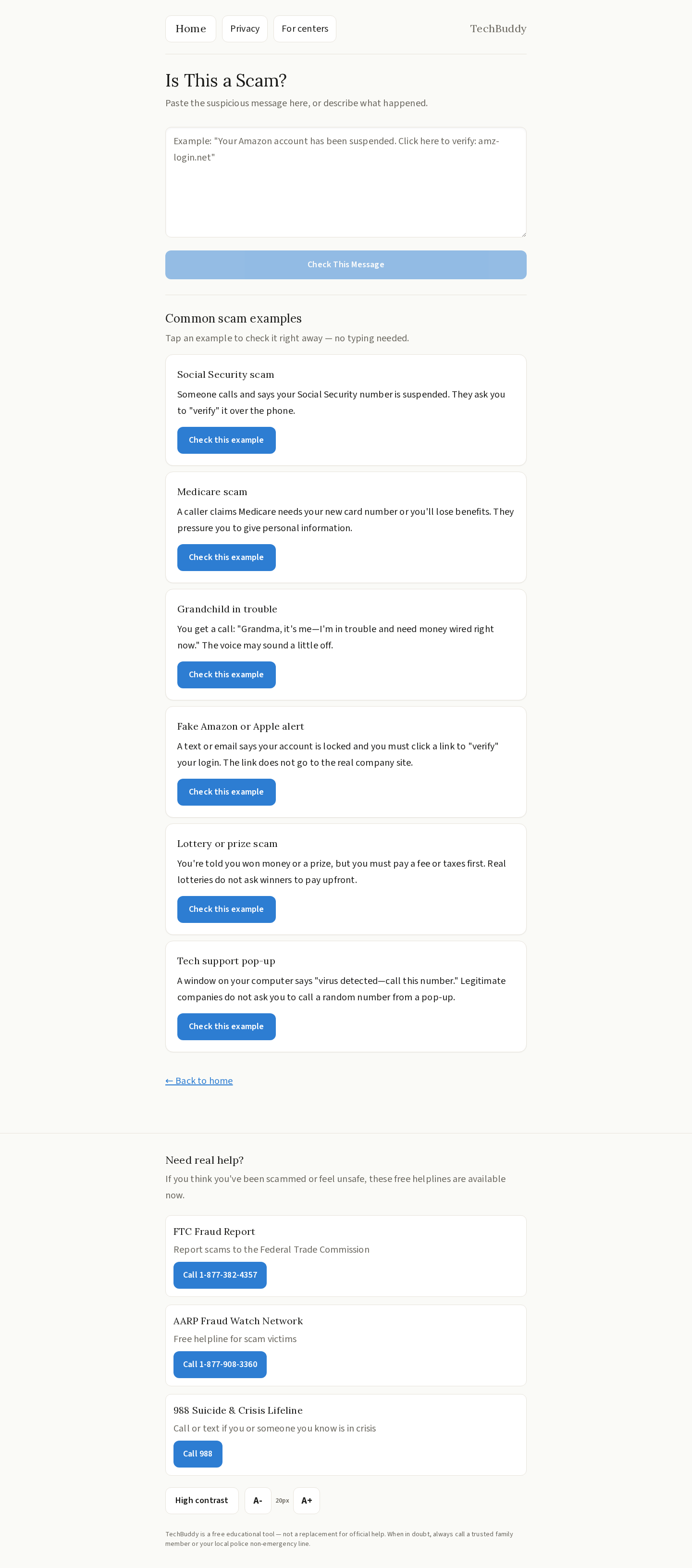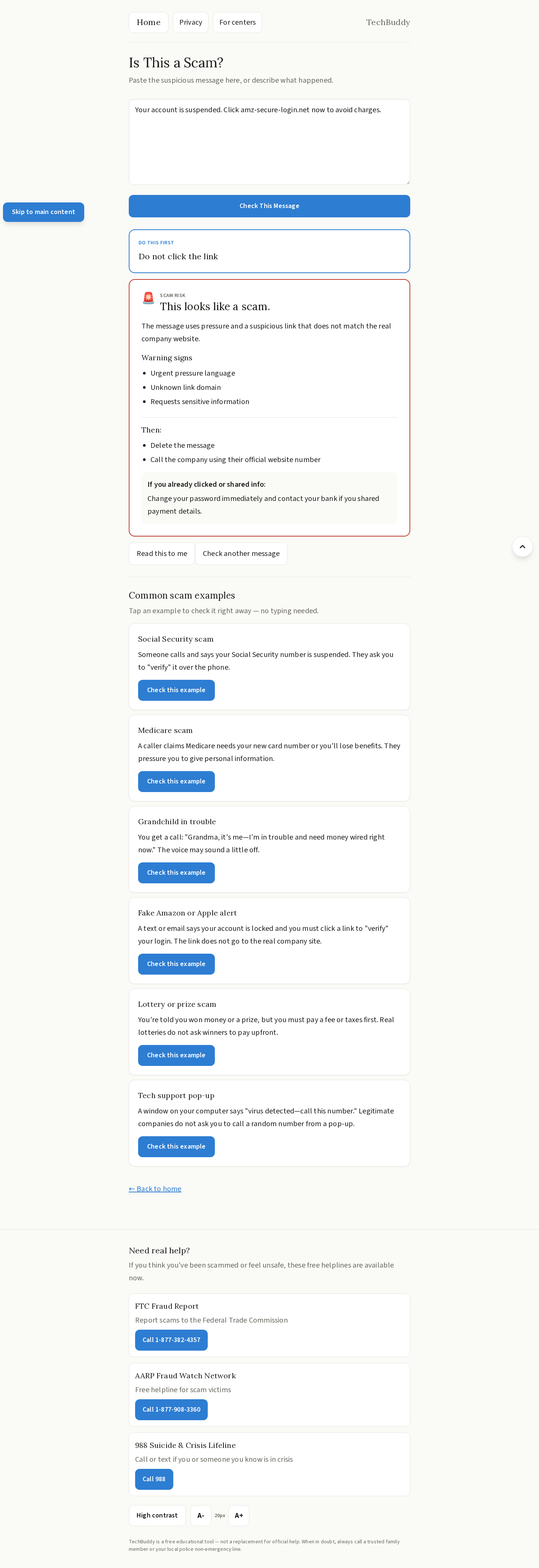 - Scam Detector — Paste any suspicious text, email, or message and get an instant safe / scam / suspicious verdict in plain language, with clear next steps.