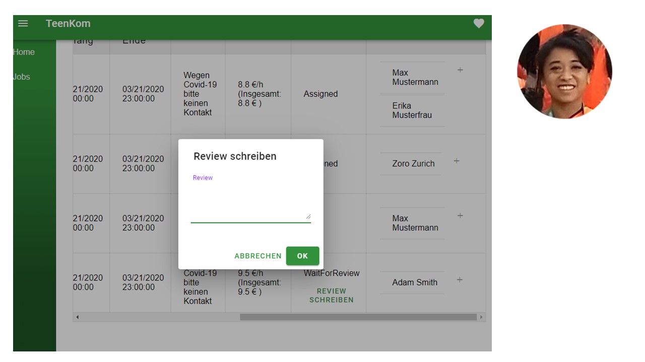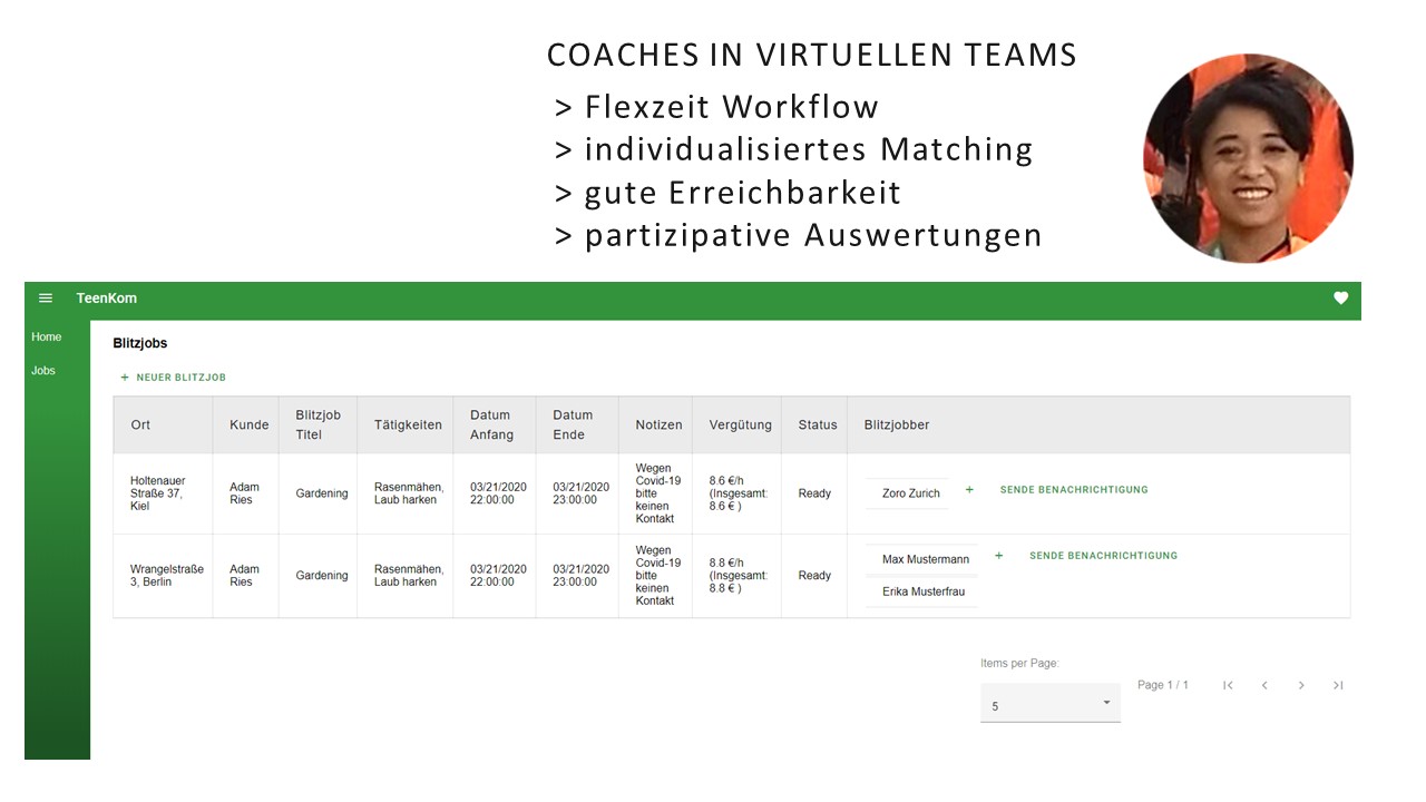 - ebenfalls mittelfristig sollen Fachleute auf überregionaler Basis die Möglichkeit bekommen, bei der TeenKom Plattform mitzuwirken. Im Rahmen einer Skalierung sollen ortsunabhängige Teams mit bis zu 10 Fachleuten entstehen, die in Flexzeit ca. 50-80 Einsatzstellen und ebenso viele Blitzjobber*innen (fern)betreuen.