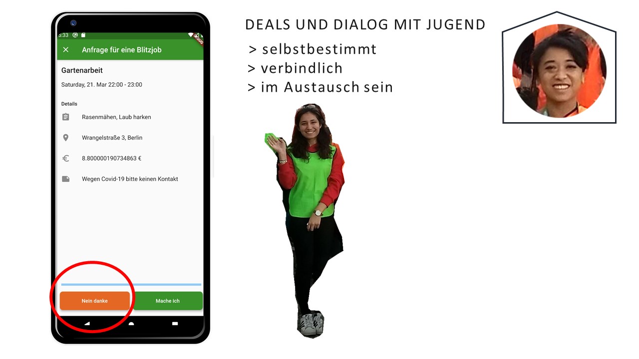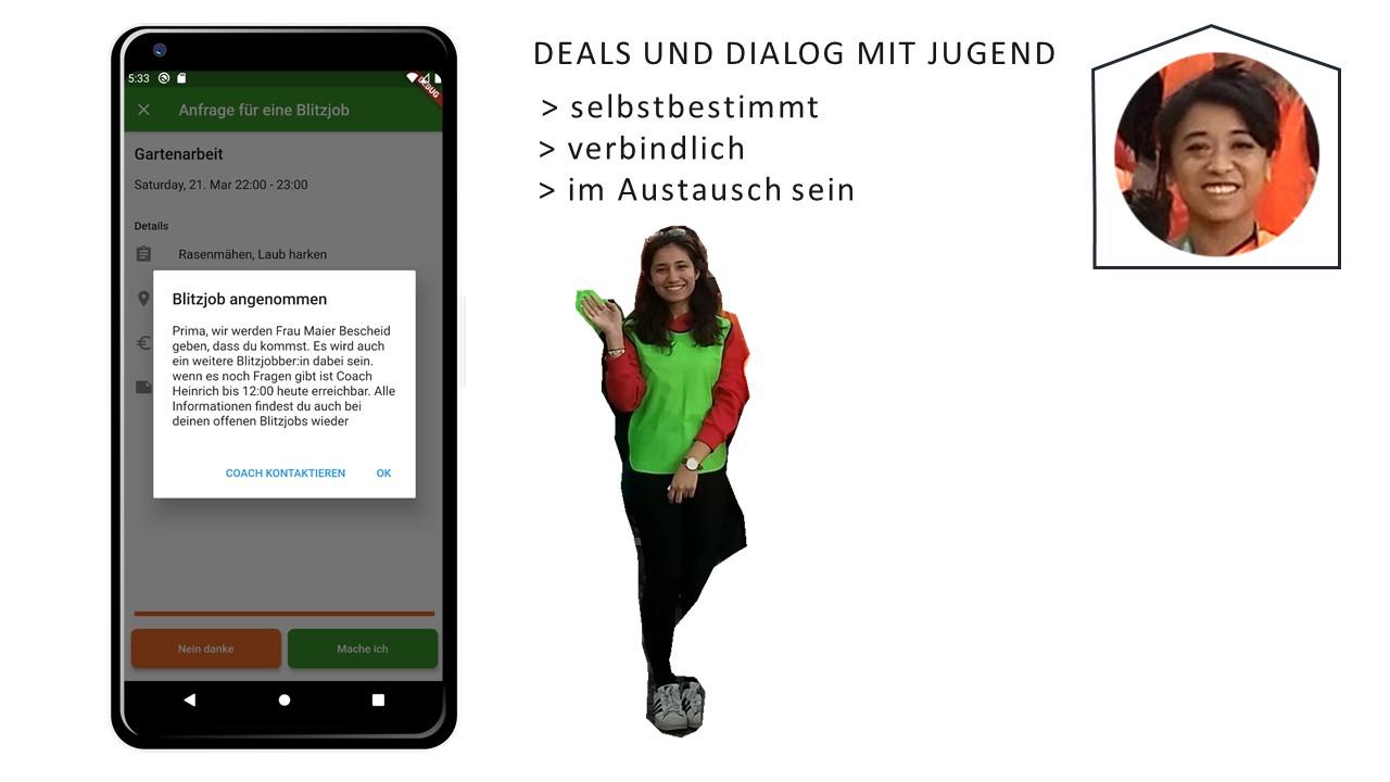 Erklärung zu Demo (siehe Video) Samira ist bereits bei TeenKom angemeldet, und bekommt ein Blitzjob-Angebot. Falls sie sich nicht sicher ist, ob sie kann, muss sie sich nicht jetzt entscheiden. Die Verzögerung beim Antwortbutton verhindert eine unbeabsichtigte Ablehnung. Sie kann jetzt einen Coach anrufen oder Text schicken, guckt sich dann weitere Details an und sagt zu.