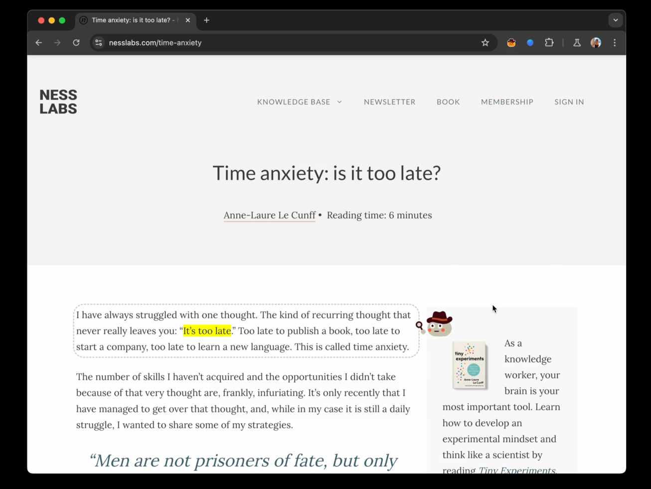 - Accessing the relevant text content of webpages. Given we only had 24 hours to build this, we decided to avoid headaches and keep it consistent it would be simpler to focus on a single website (https://nesslabs.com/), however with more time it could easily be made to work with other blogs or platforms like Substack, Medium...