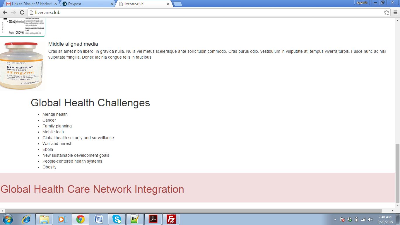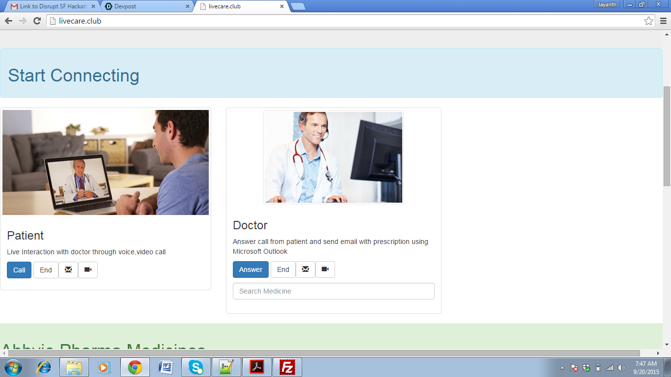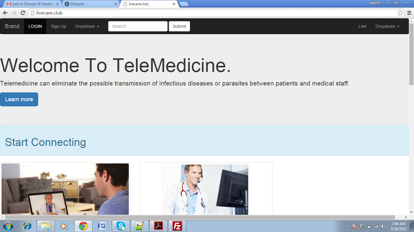 Inspiration:To Overcome global HealthCare Challenges. What it does: Solves realtime healthcare problems concerning Children health ,Maternal Pregnancy problems,Epidemic diseases like Ebola etc. How I built it:Built using bootstrap. Challenges I ran into: Accomplishments that I'm proud of:Innovating future for healthcare through global health Network Integration. What I learned:New ways to Internet of Things. What's next for TeleMedicine(www.livecare.club):Expansion and connect people with doctors. Built With bootstraphtml5