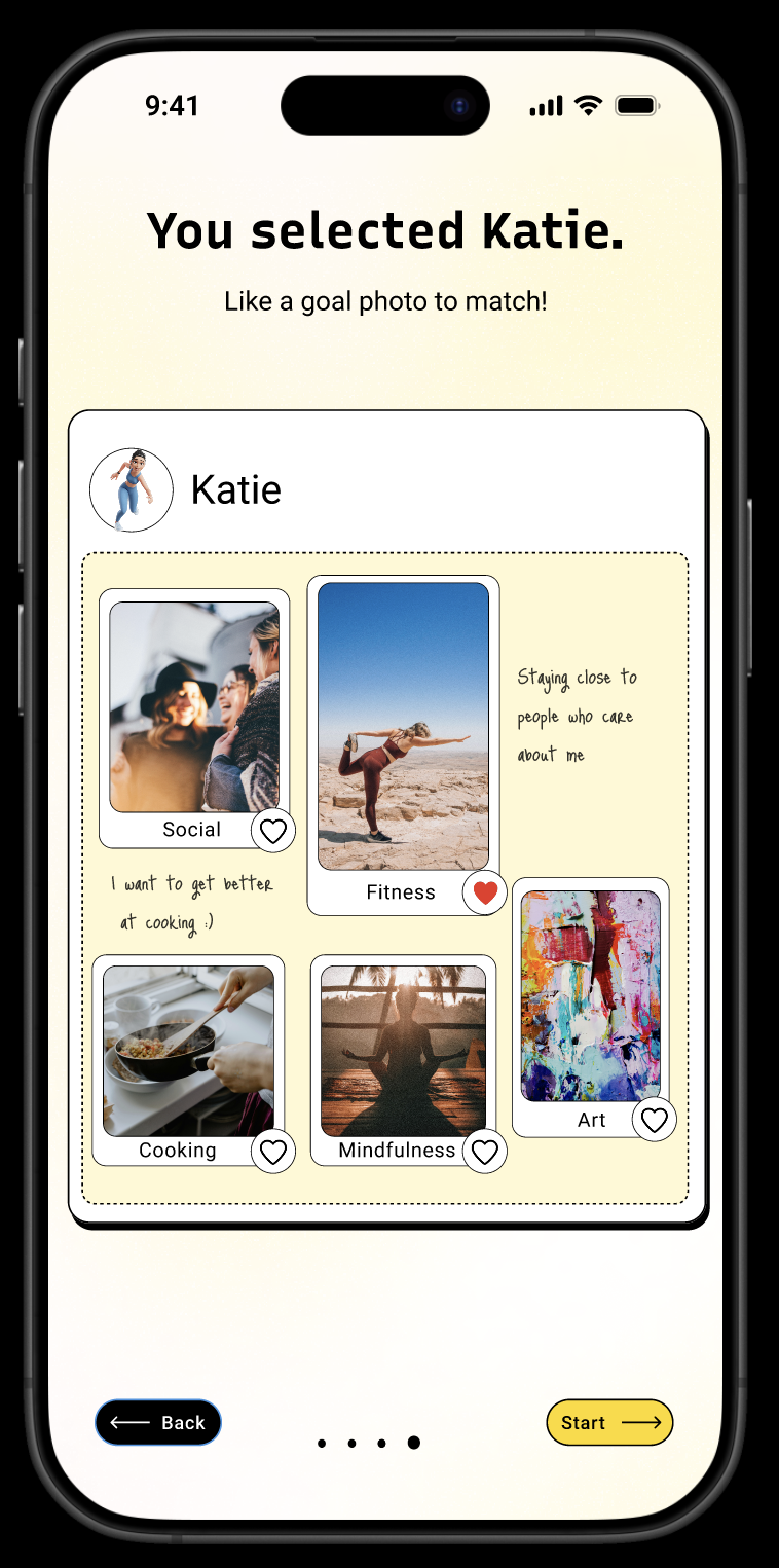 Actively deciding not to use AI in our design – Our research revealed that while AI offers hyper-personalization, it diminishes users' ability to choose what they genuinely like, and often leads to endless scrolling and a loss of personal agency. In a survey, most students valued personalization but wanted a more streamlined experience. To address this, we implemented a feature that automatically matches users with potential partners based on the alignment of their vision boards, eliminating the need to manually sift through profiles. This keeps the process efficient, while still allowing for meaningful personalization without reinforcing the scrolling cycle.