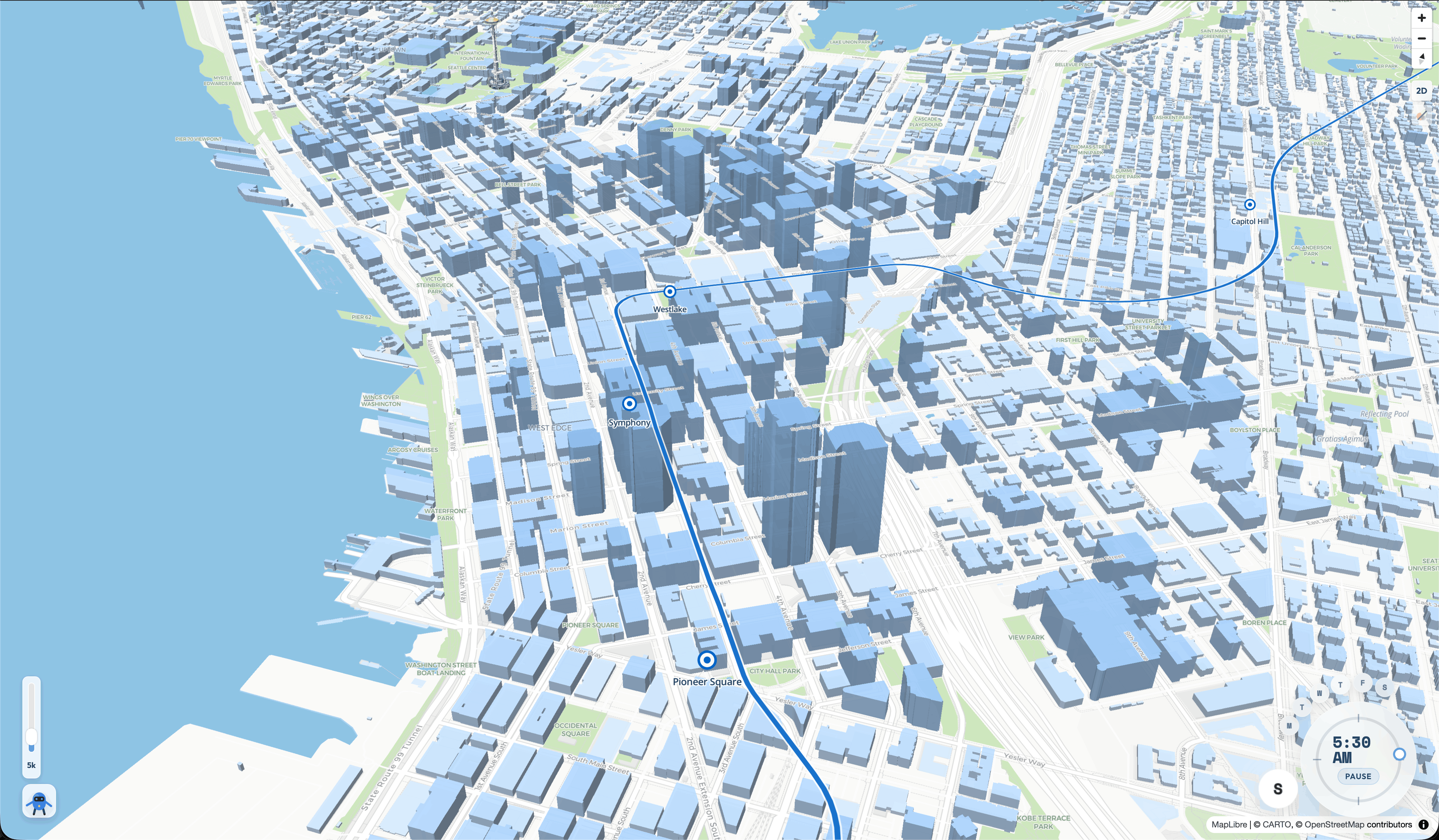 Our demo loads Seattle from authoritative Building_Outlines_2023 footprints joined offline to official 3D building shells. The same pipeline runs on any city with public footprint data, buildings stream in by neighborhood with a live status panel so even a cold load feels instant.