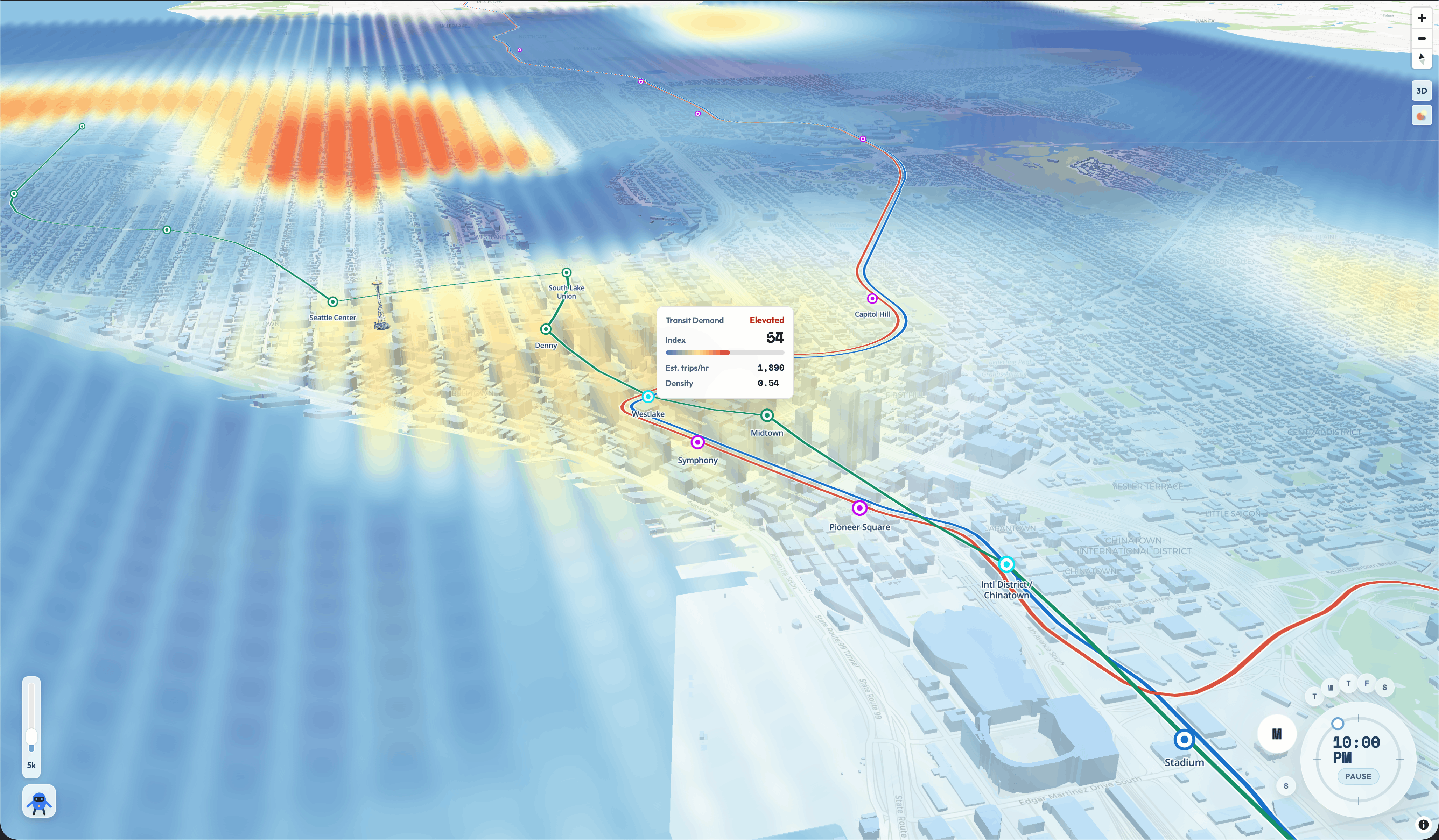 - A transferable demand model: trained once on historical transit data, applied to any city with GTFS plus a census population layer. Seattle is our demo; the architecture is portable on day one.