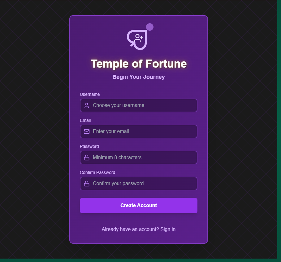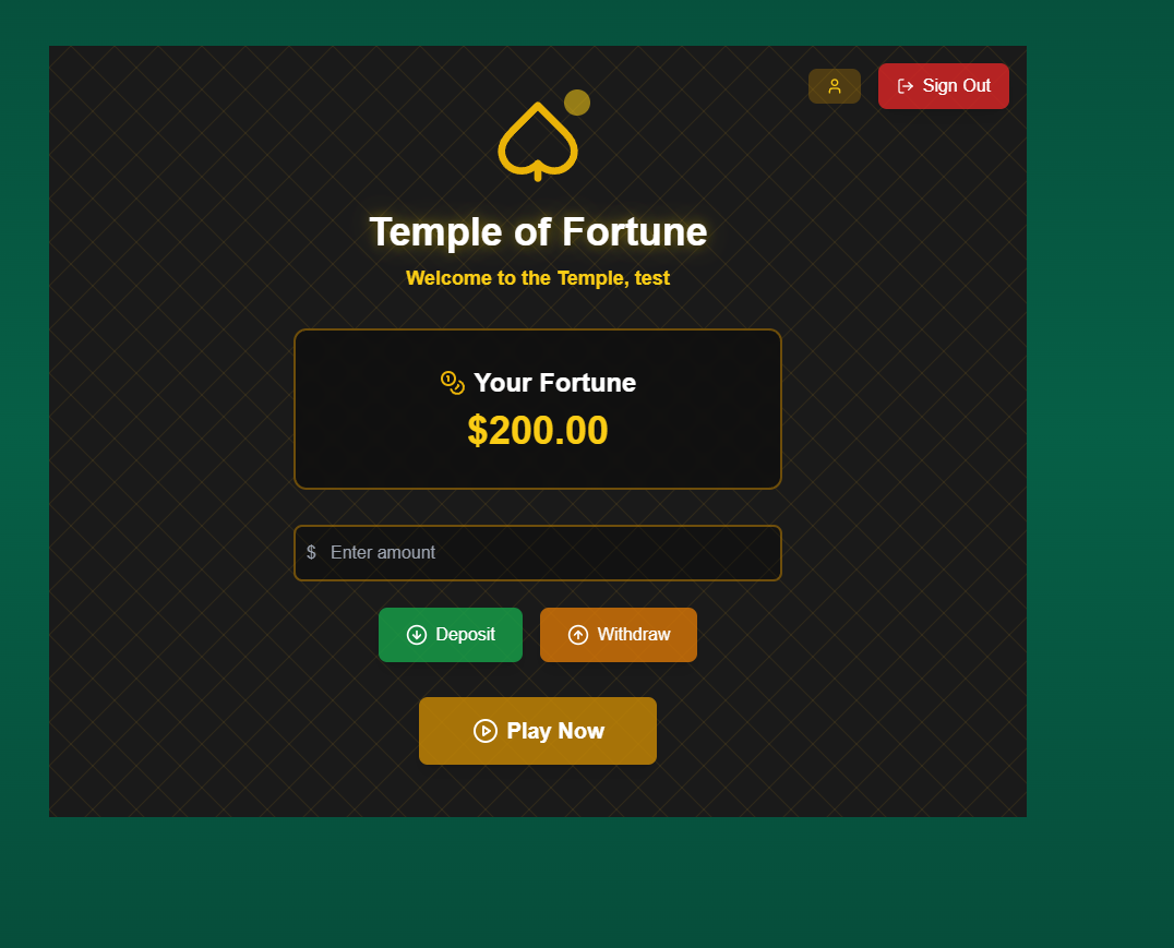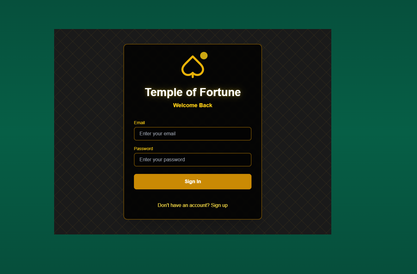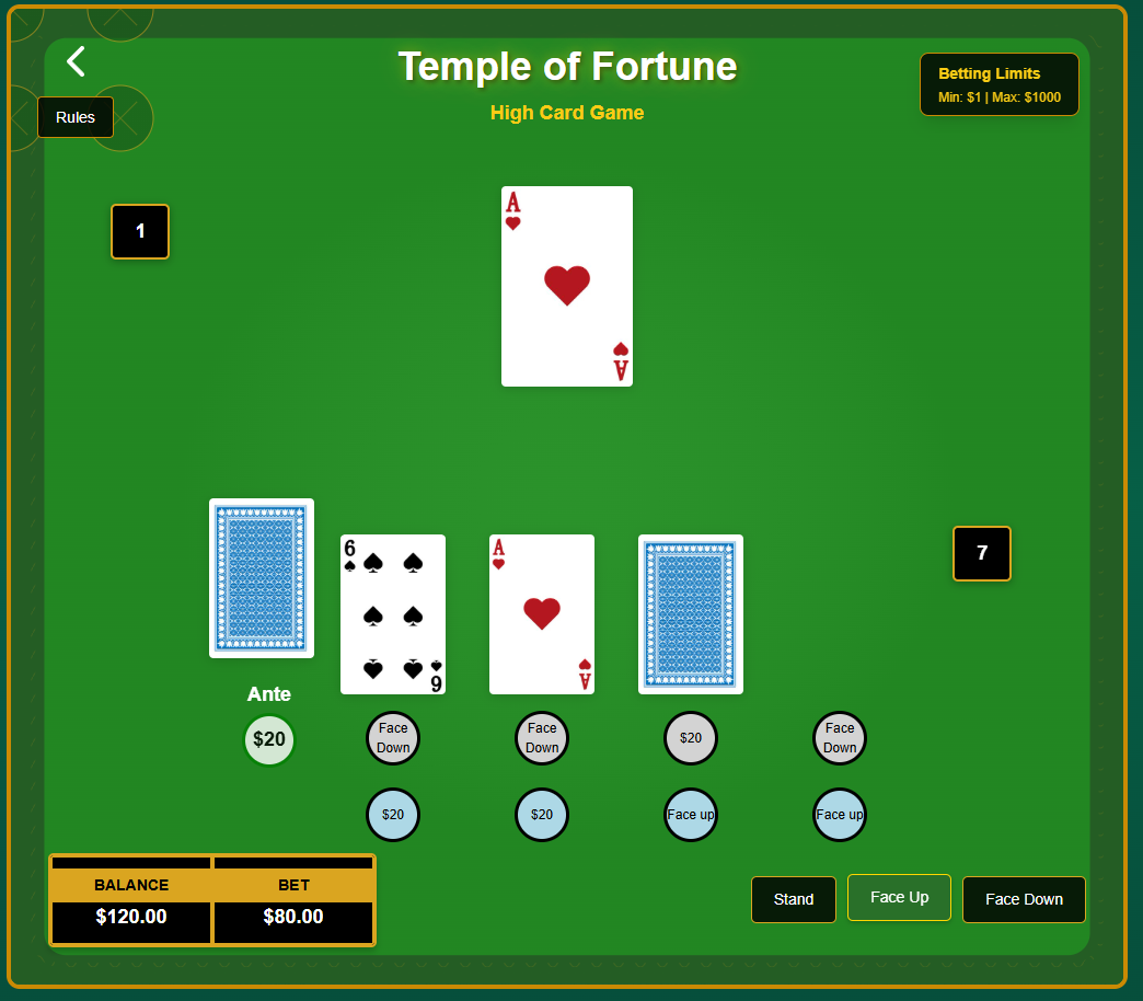 Temple of Fortune is a card game where players try to beat the dealer's score without going over 20. Players can choose between safe face-up bets (1:1) or riskier face-down bets (2:1), adding a layer of strategy to each hand. The game features a clean casino interface with chip selection, multiple betting spots, and animated card dealing.