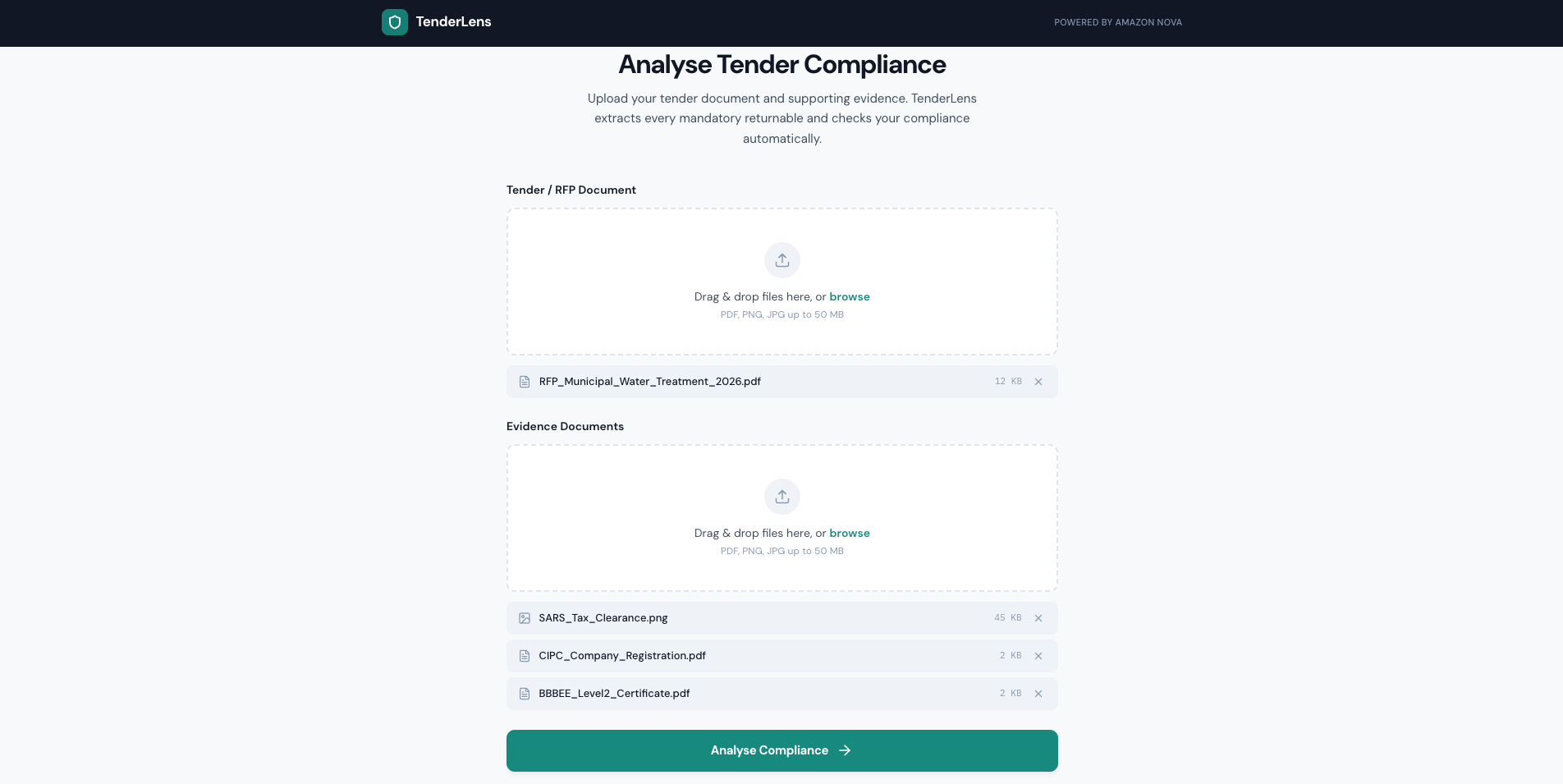 Upload a tender pack and your evidence documents — PDFs, scanned certificates, images. TenderLens handles all modalities.