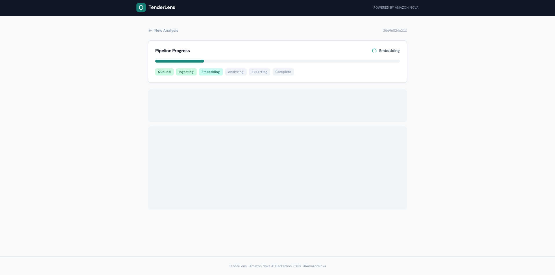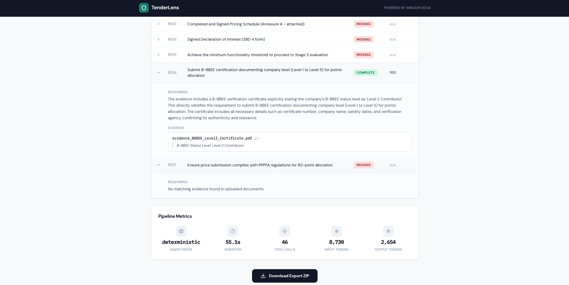 - Extracts mandatory returnables from the tender pack using Amazon Nova 2 Lite, identifying every document and compliance requirement the bidder must submit