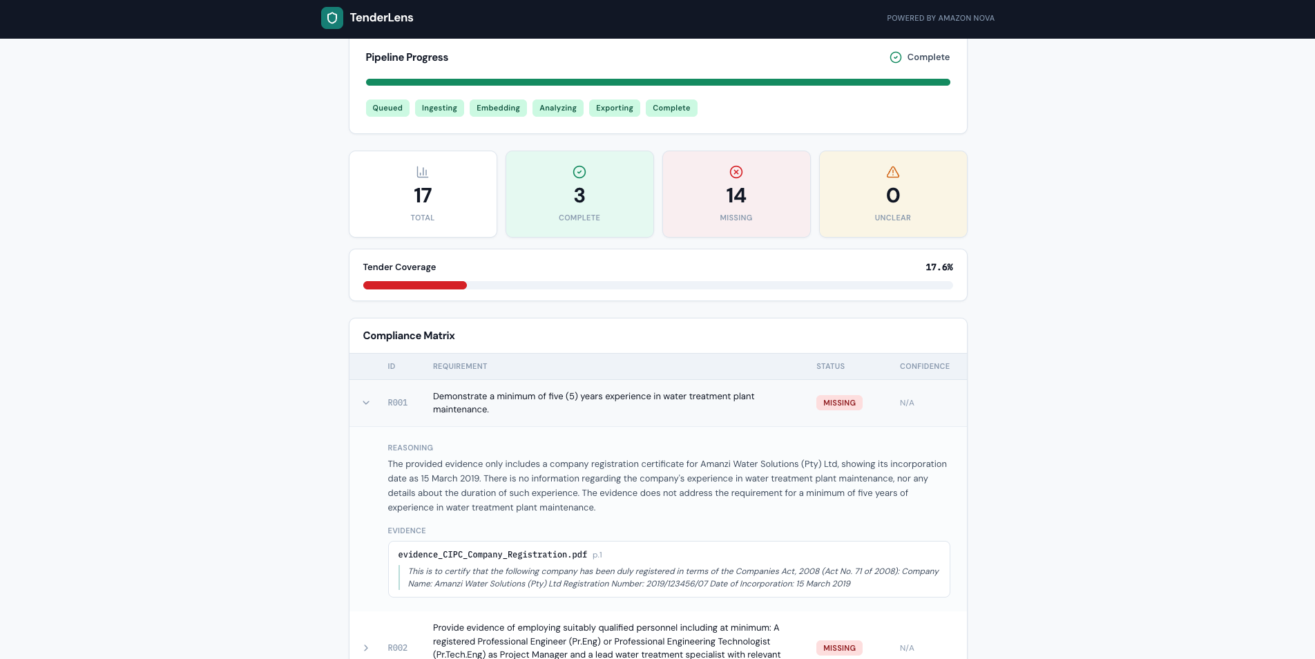 Evidence-backed compliance matrix: 3 complete, 14 missing, 0 unclear — each decision grounded in Nova's cross-modal document analysis.