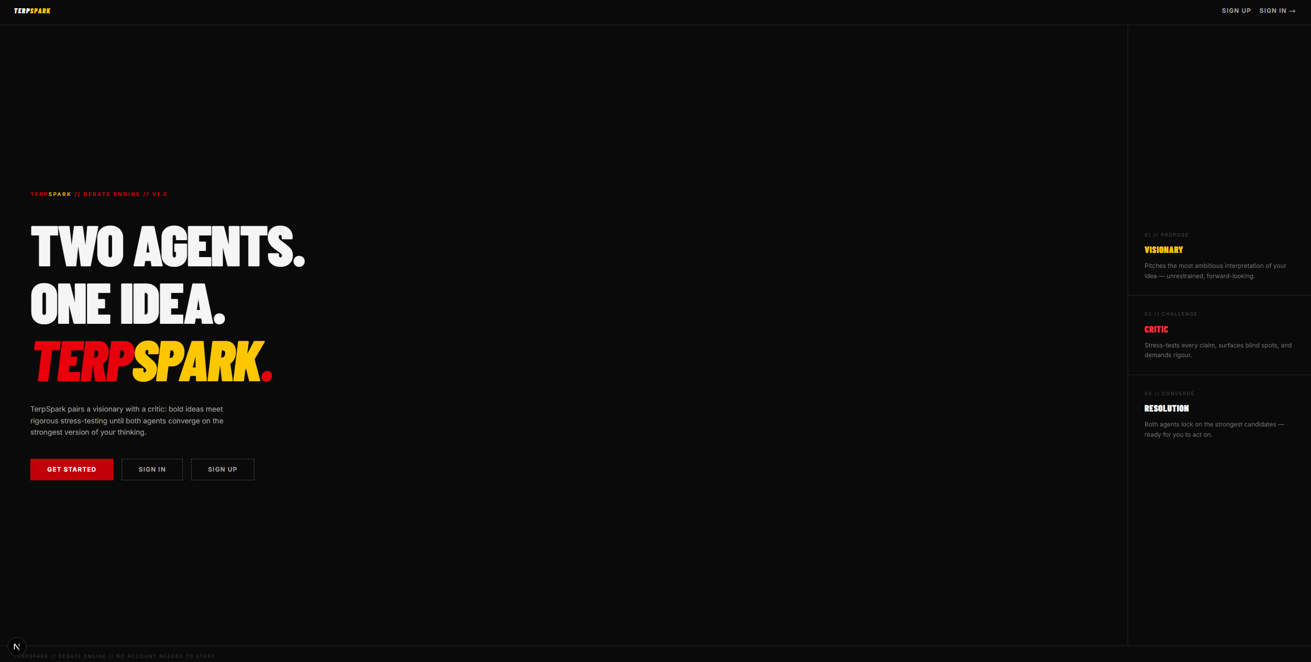We built TerpSpark as a Next.js 16 app with the App Router, React 19, and TypeScript. The UI uses Tailwind CSS v4 and shadcn/ui components with a dark, editorial aesthetic. On the backend, a server-side orchestrator manages the debate loop: Visionary speaks, Critic responds, stances decay each exchange via asymmetric simulated annealing, and a Judge LLM periodically evaluates convergence. We stream all agent output to the client over SSE with word-by-word throttling at the average human reading speed (~250 WPM) so it feels like a real conversation. Authentication runs through Firebase (client + Admin SDK), sessions persist in Azure Cosmos DB, and we support a multi-provider LLM fallback chain (TerpAI, Gemini, Claude, OpenAI, and Groq), so the app automatically uses whichever API key is available. We didn't have access to any TerpAI API key, so we decided to use fallback mechanisms such that it is easily integratable. The marketing landing page features an HLS background video via Mux and hls.js with a liquid-glass card design.