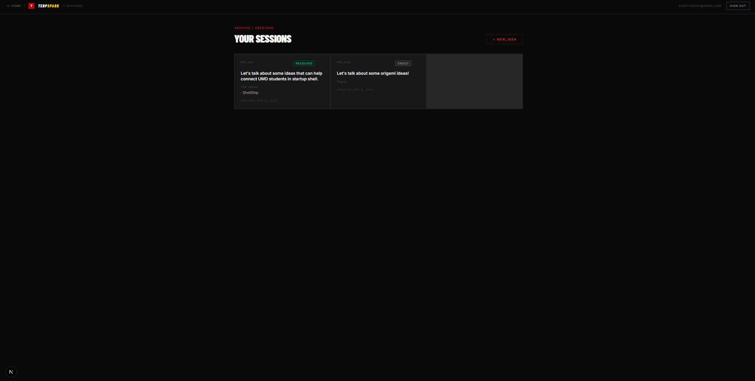 TerpSpark is an AI-powered debate engine for brainstorming. You give it a topic and a target number of ideas, and two AI agents: a Visionary (ambitious, forward-looking) and a Critic (rigorous, stress-testing) debate in real time using Server-Sent Events streaming. A third Judge agent silently watches the transcript and decides when both sides have genuinely converged on shared candidate ideas. When convergence happens, the top ideas are surfaced and the user can give feedback, redirect the discussion, or end the session. The platform also supports UMD-specific contexts (Startup Shell, QUEST, FIRE, Hackathon, Thesis Direction, etc.) that inject grounded knowledge into the agents' prompts so the debate is tailored to your actual program. No account is required to start, Firebase auth is optional for saving sessions.