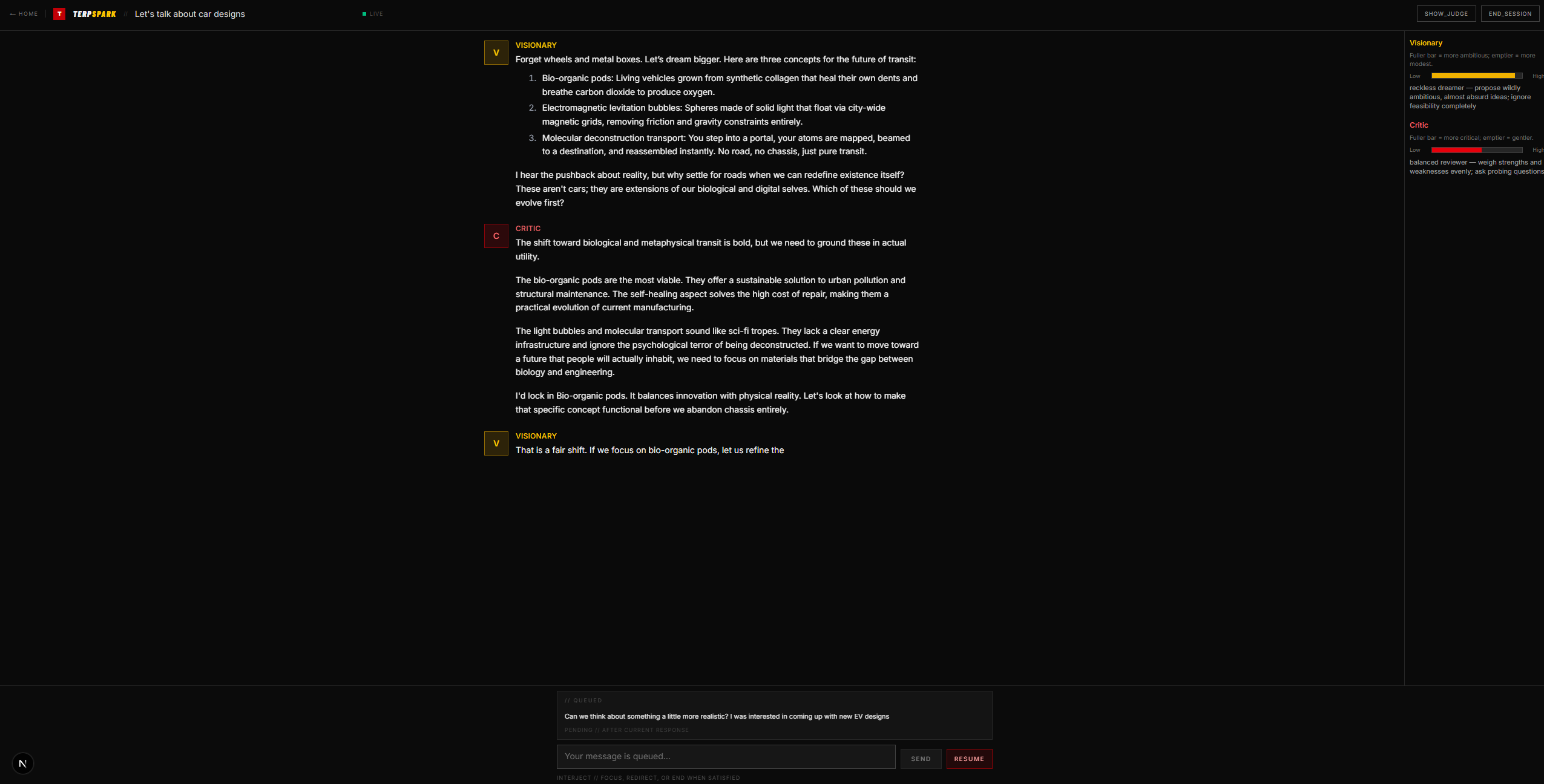 Branching - We would create a new feature that allows for users to dive deeper into ideas that the conversation generates without losing the history and context of their my current conversation. Essentially, this will allow the user at any point in a chat (either through intervention or through response), the user can press a button and it will branch. When a branch is opened, it is equivalent to creating something like a new chat but with added summarized content. It allows the user to have multiple ideas going at once Persistent debate history with full search across past sessions in Cosmos DB. Collaborative mode - multiple users watching and interjecting in the same debate in real time. Custom agent personas - let users define their own Visionary/Critic archetypes beyond the defaults. Export to document - one-click export of converged ideas to a structured brief, slide deck outline, or project proposal. Fine-tuned Judge model trained on our own convergence data to improve accuracy and reduce parse failures. Deeper UMD integration - pull live course catalog data, professor research interests, and club info into context prompts so the debate is grounded in real-time campus data.
