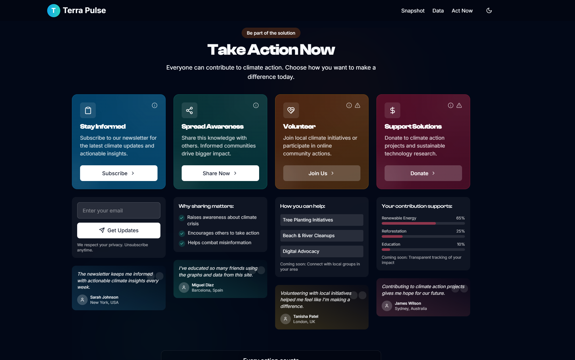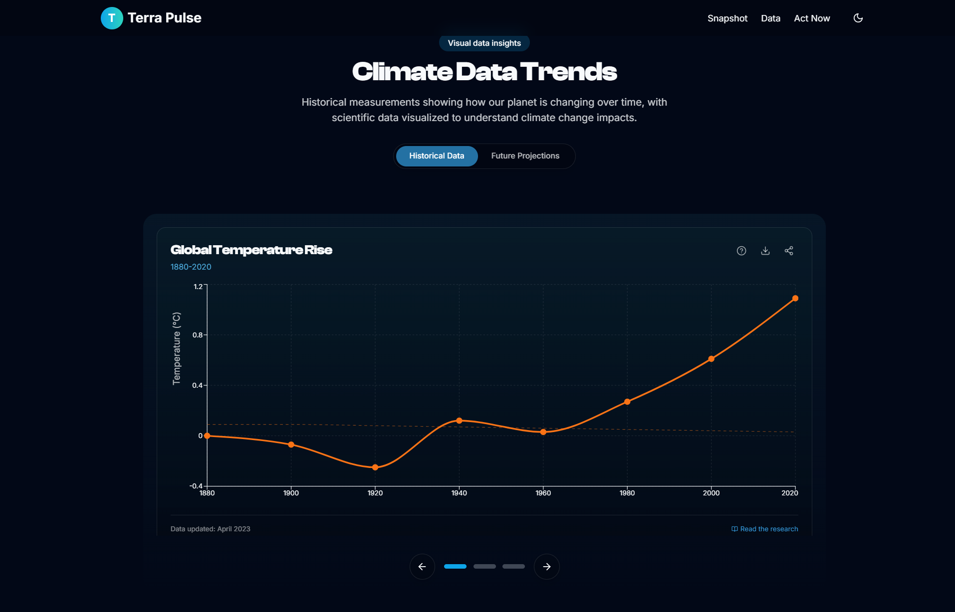I created Terra Pulse after witnessing the disconnect between complex climate data and public understanding. Seeing how data visualization could transform abstract numbers into powerful stories, I wanted to build a platform that would make climate science accessible to everyone, regardless of their scientific background.