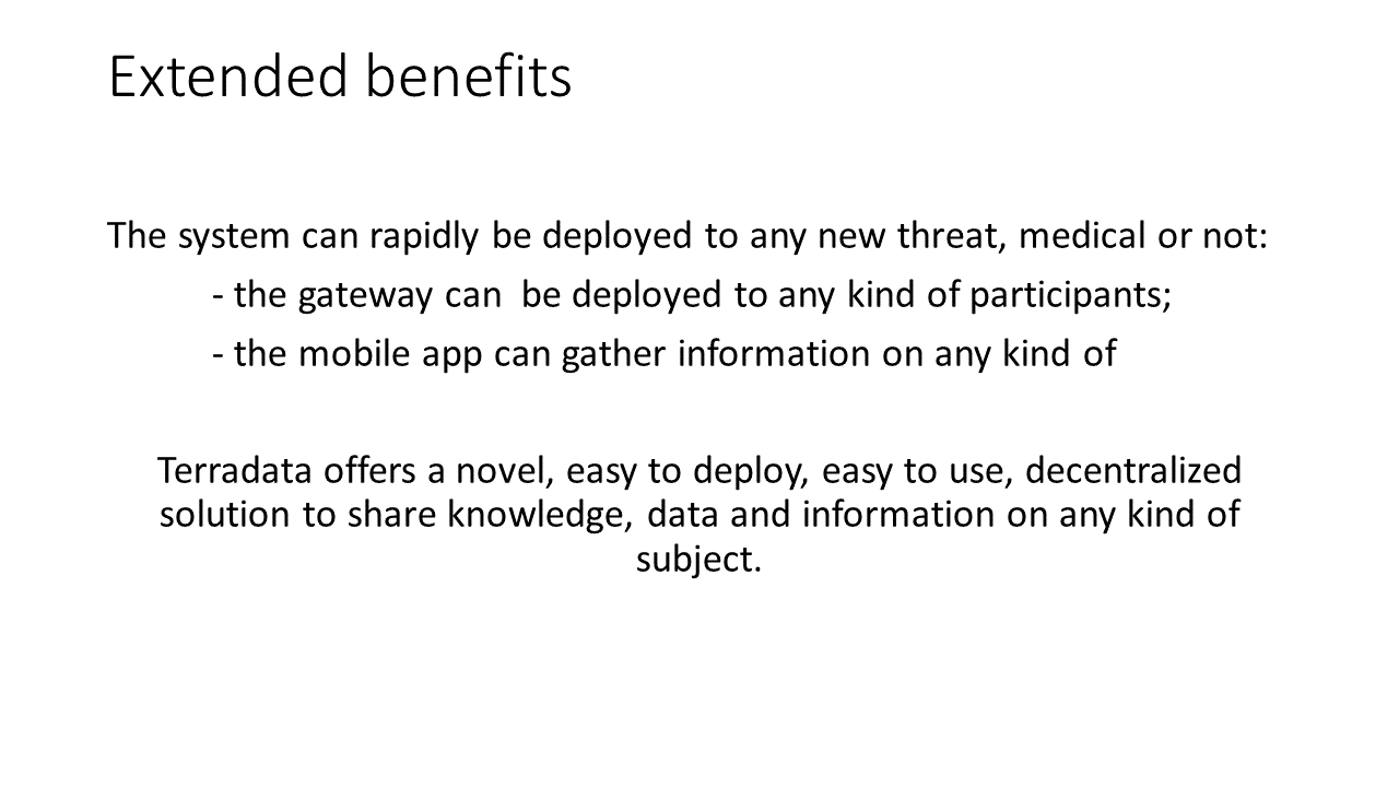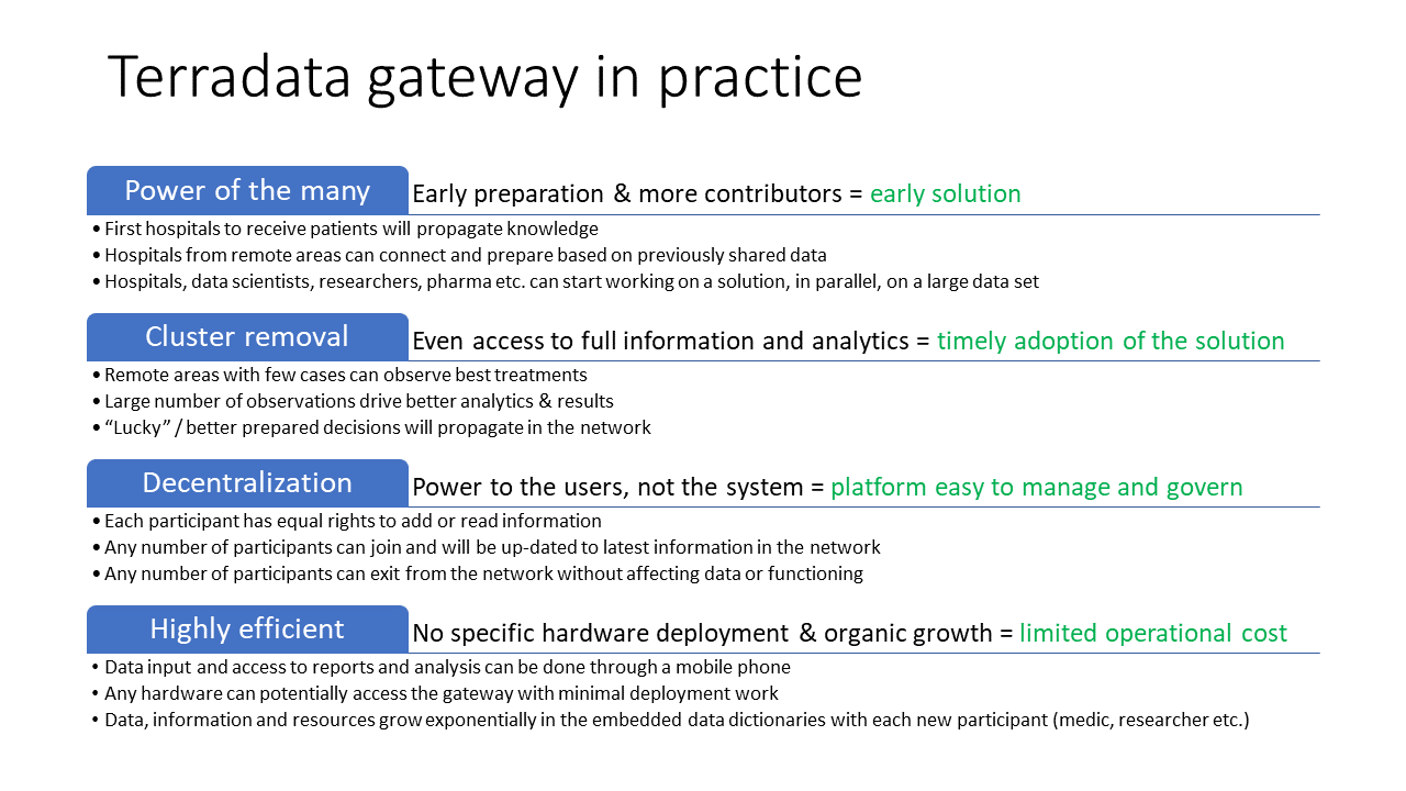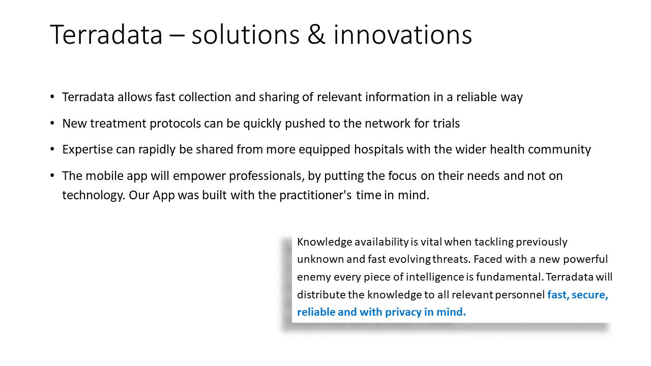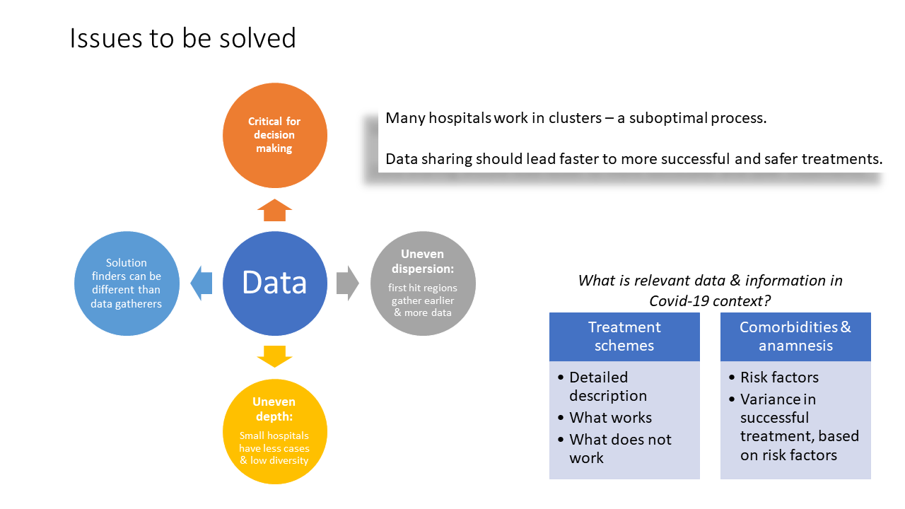 In a nutshell, knowledge availability is vital when tackling previously unknown and fast evolving threats. Every minute and every piece of information can save a life. Medical staff work day in and day out to save lives. Faced with a new powerful enemy every piece of intelligence is fundamental. Our solution aims to distribute the knowledge to all relevant personnel fast, secure, reliable and with privacy in mind.