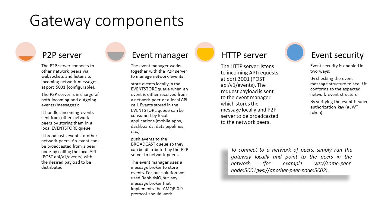 The P2P synchronization gateway has three components, a P2P server, an event manager and a HTTP server. To connect to a network of peers, simply run the gateway locally and point to the peers in the network (for example ws://some-peer-node:5001;ws://another-peer-node:5002).