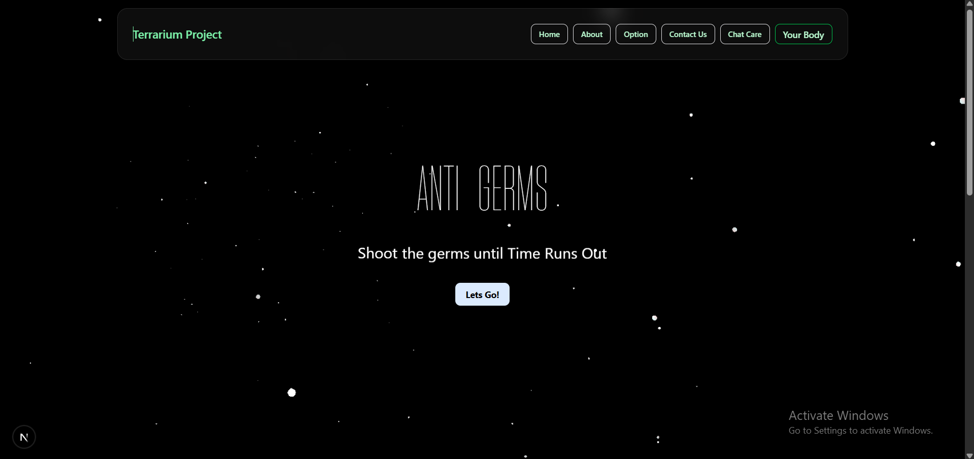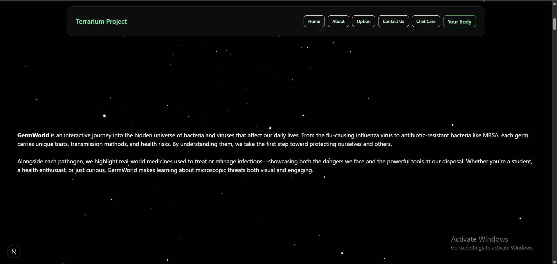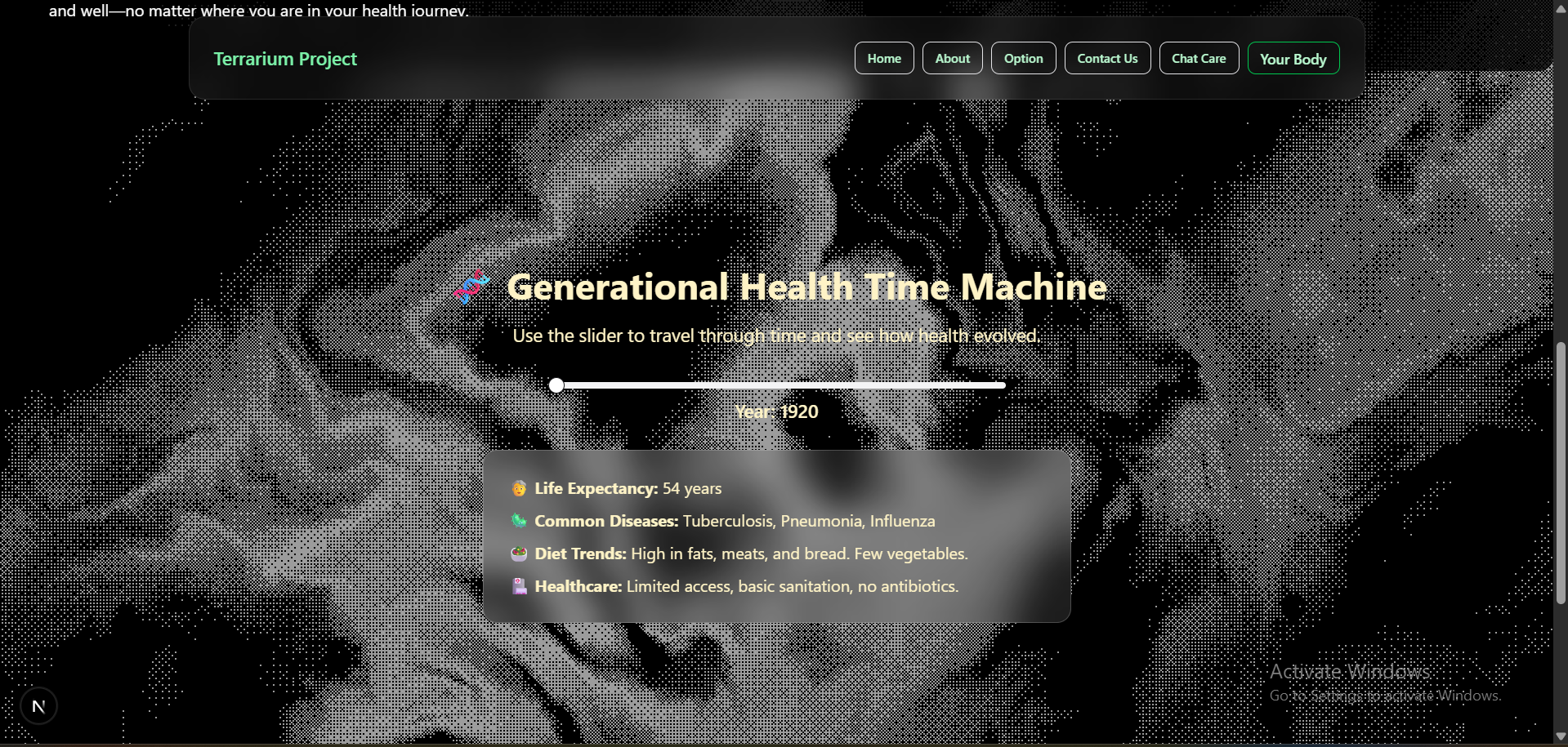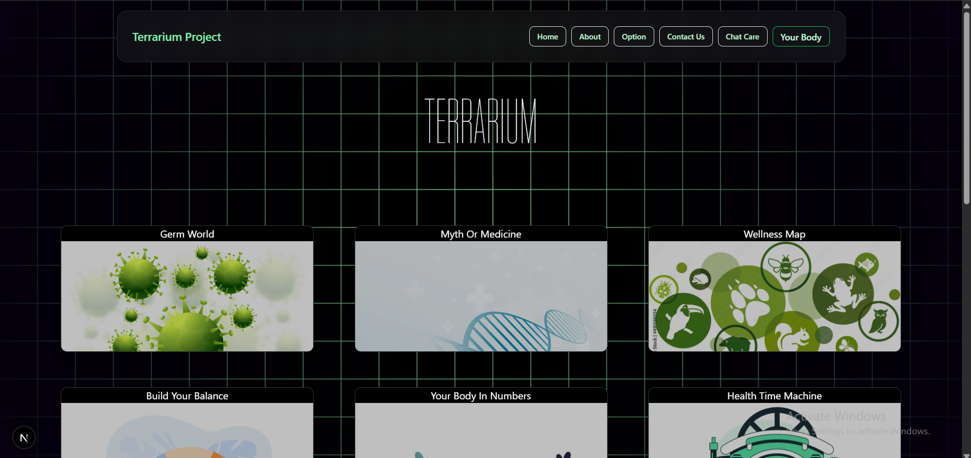 Terrarium is inspired by the interactive and playful style of Neal.fun, a site where learning is driven by curiosity and creativity. We wanted to bring that same joyful and accessible learning experience to the topic of health and well-being—targeted at kids, teens, or anyone looking to explore health in a fun way.